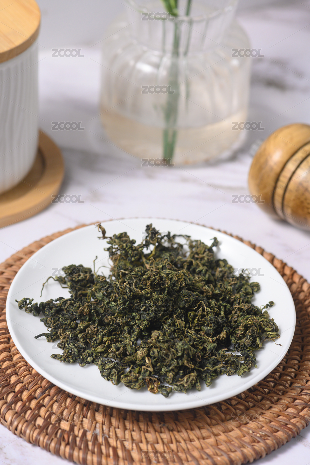 桌面上的盘子里的干爽清香的高山绿茶
