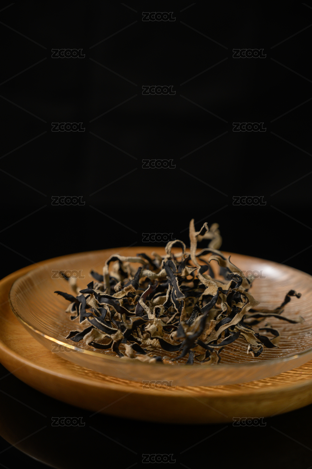 桌面上的盘子粒的干爽的干木耳丝
