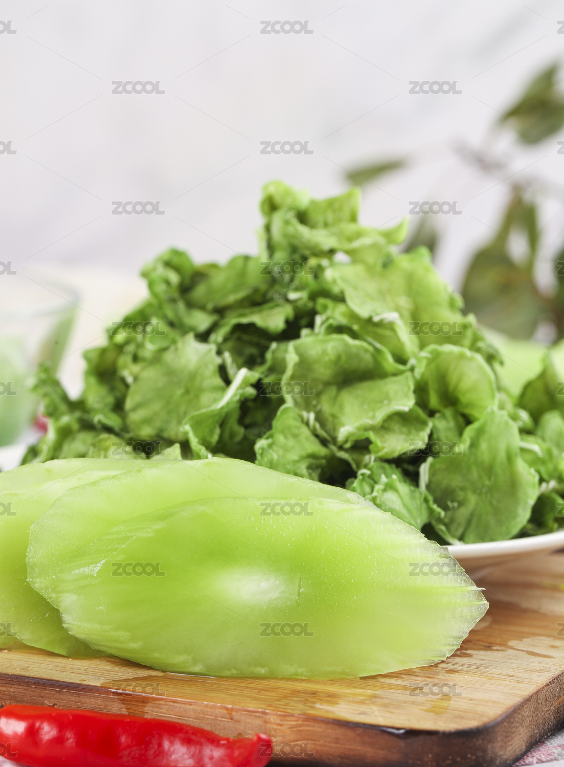 木板上放着一盘莴笋干和切块的新鲜莴笋