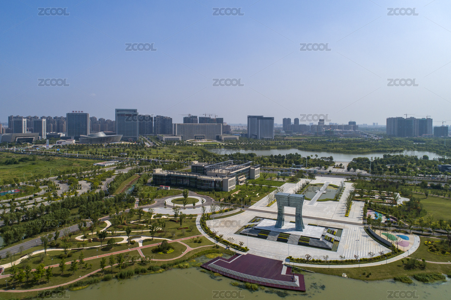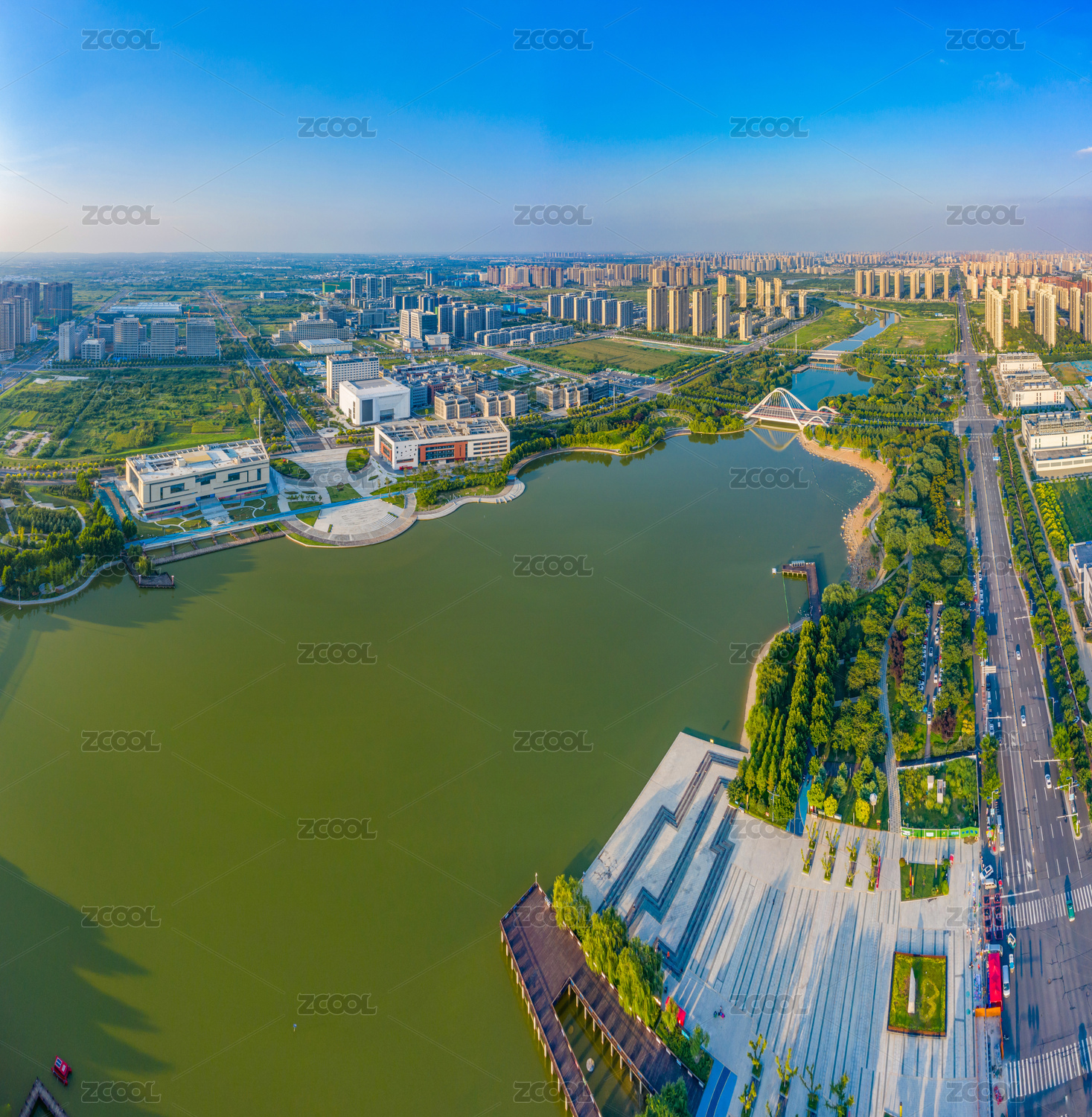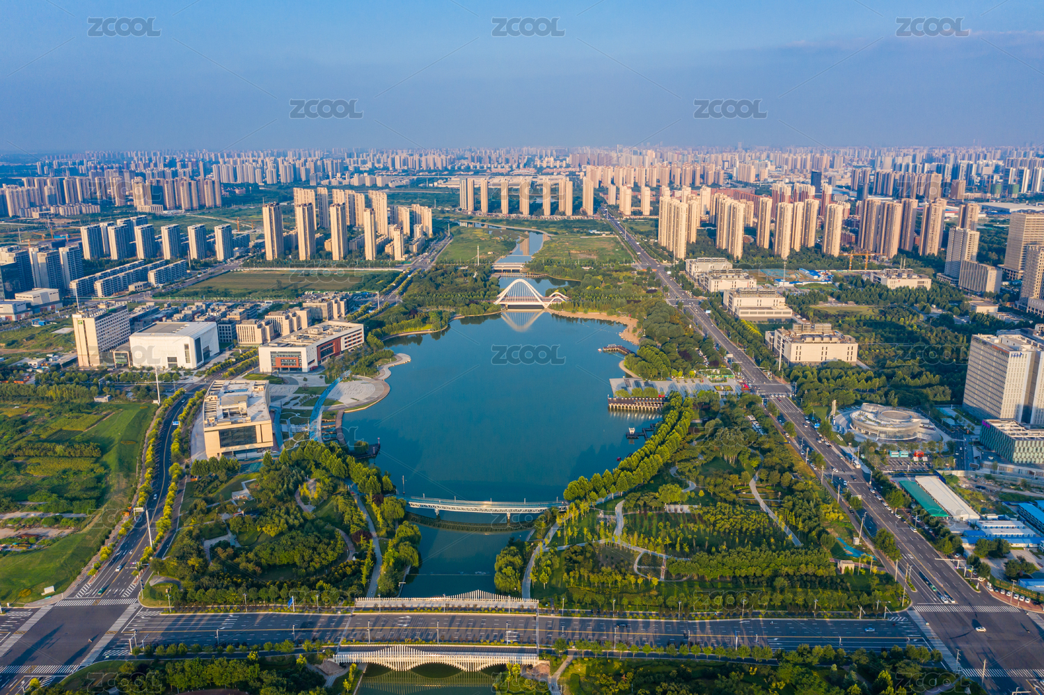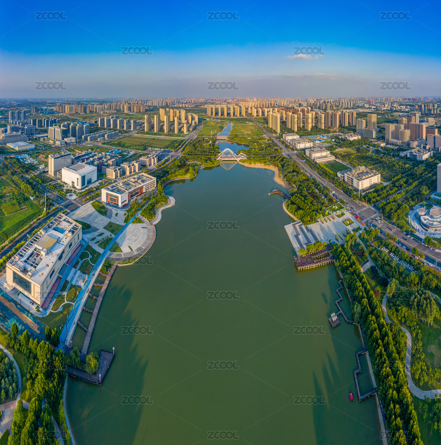 航拍郑州高新区天健湖公园城市湿地湖泊水系