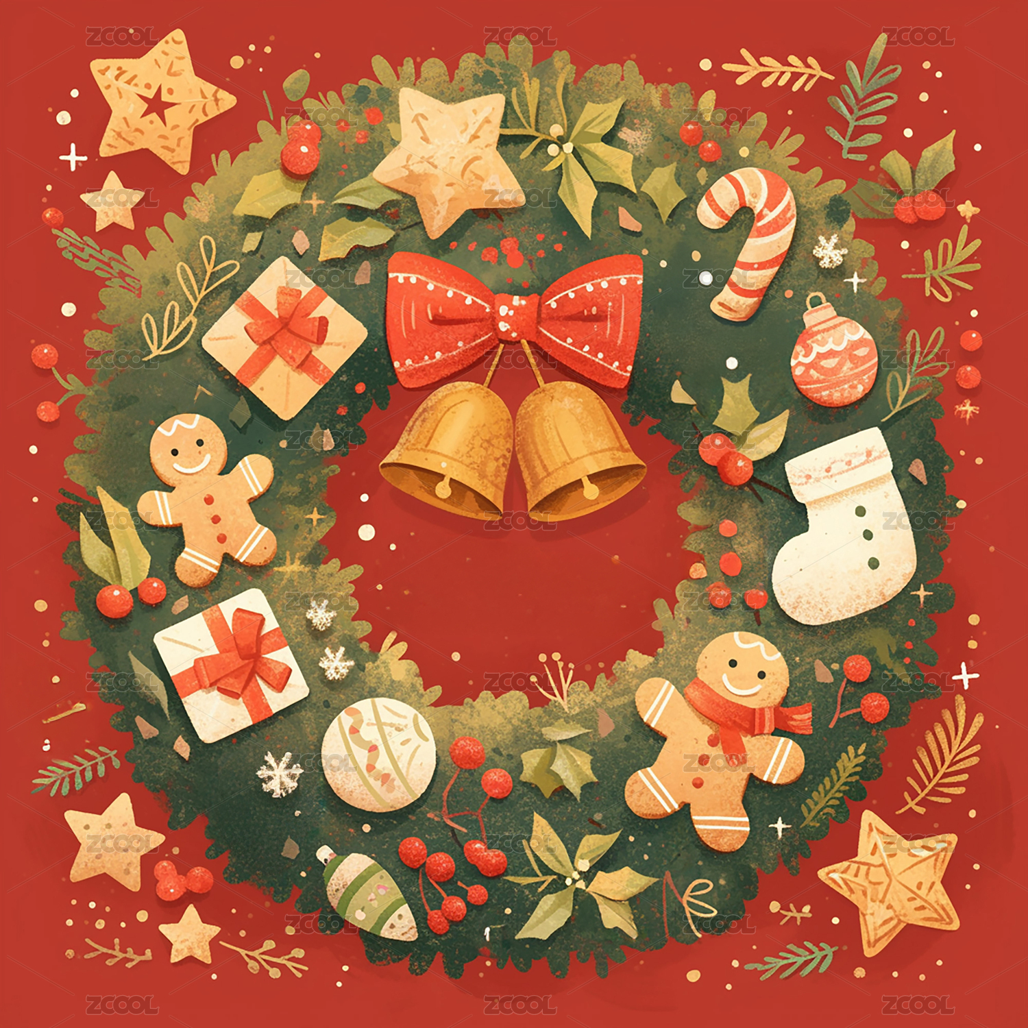 圣诞节圣诞花环扁平噪点贺卡卡片包装插画