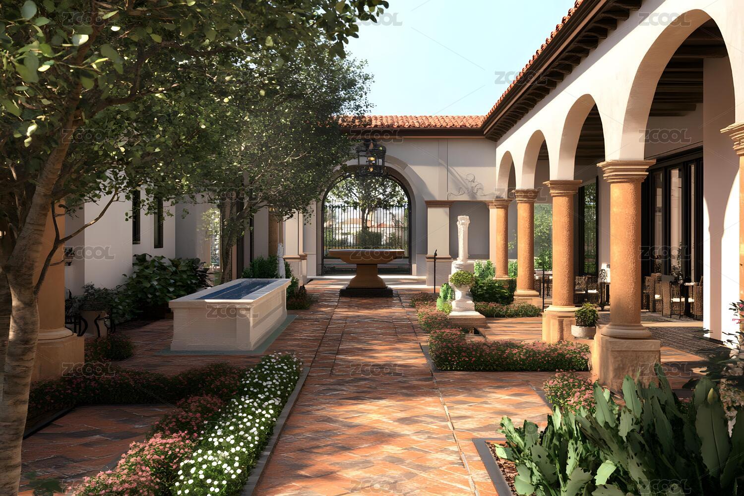 建筑,阿拉伯,古老,柱子,拱门,庭院,橄榄,树木,植物,喷泉