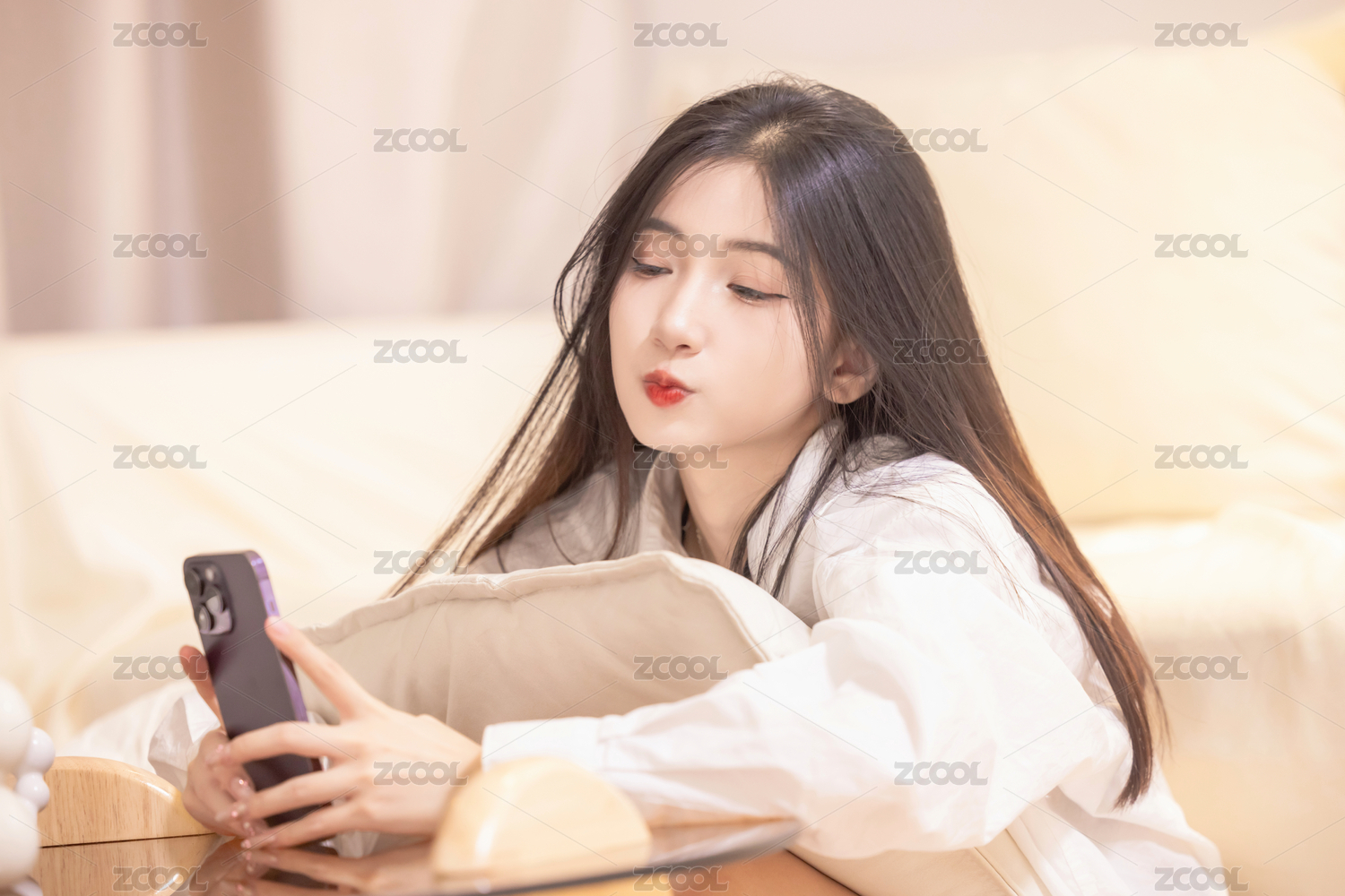 一位年轻女性躺在沙发上玩手机自拍发语音