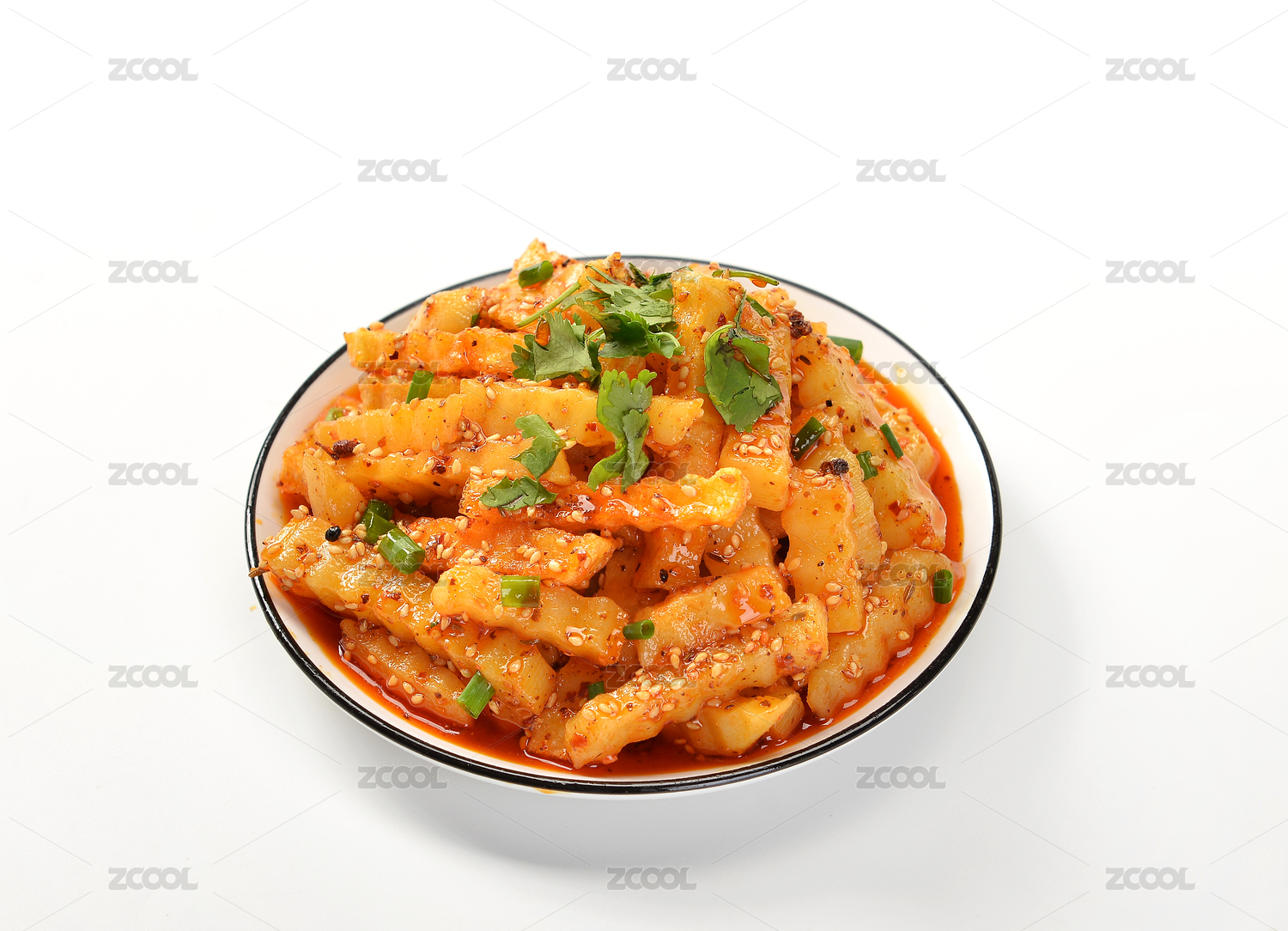 麻辣榨菜丝特写佐餐咸菜白色背景