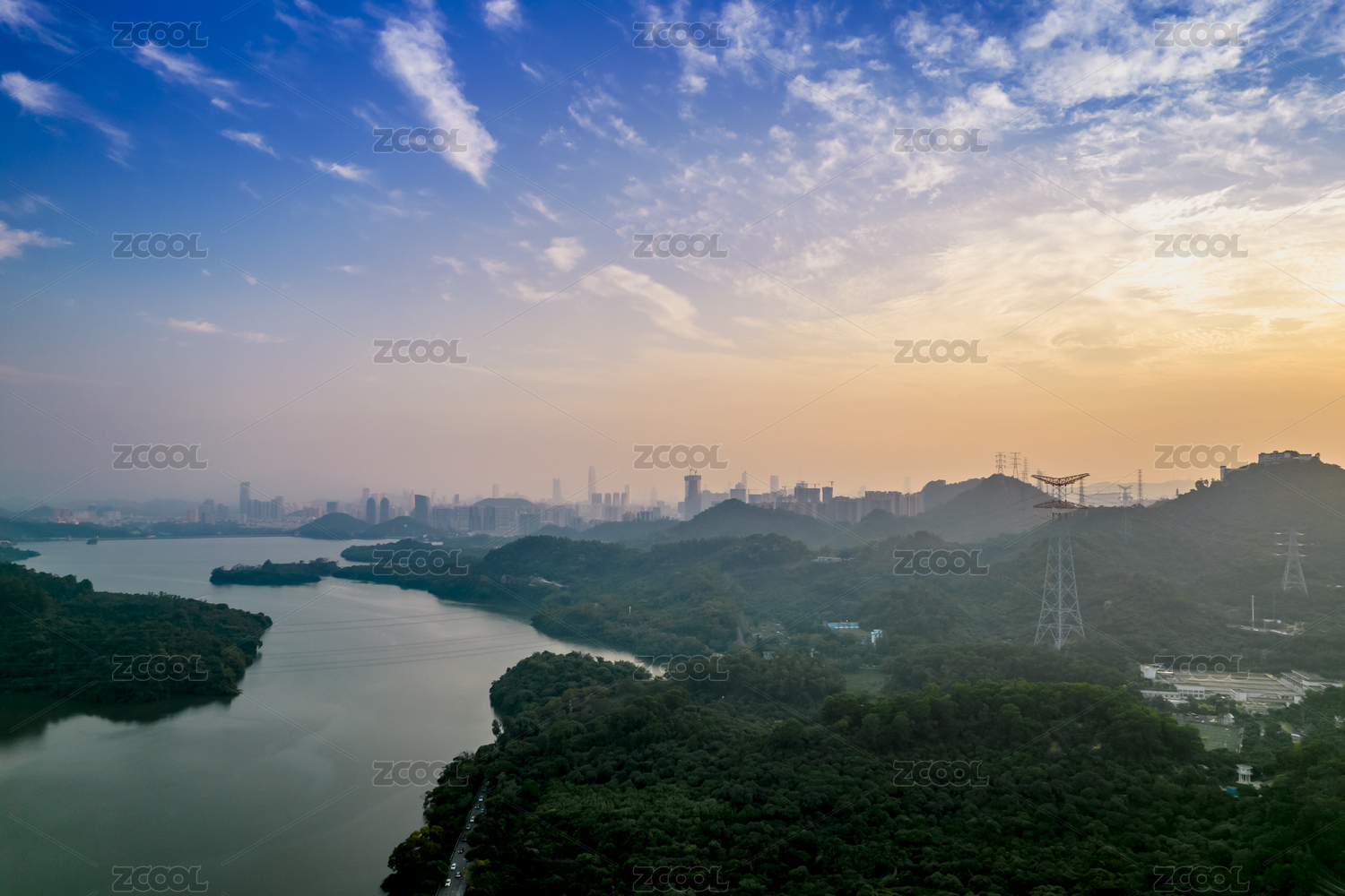 深圳罗湖莲塘航拍日落前的深圳水库