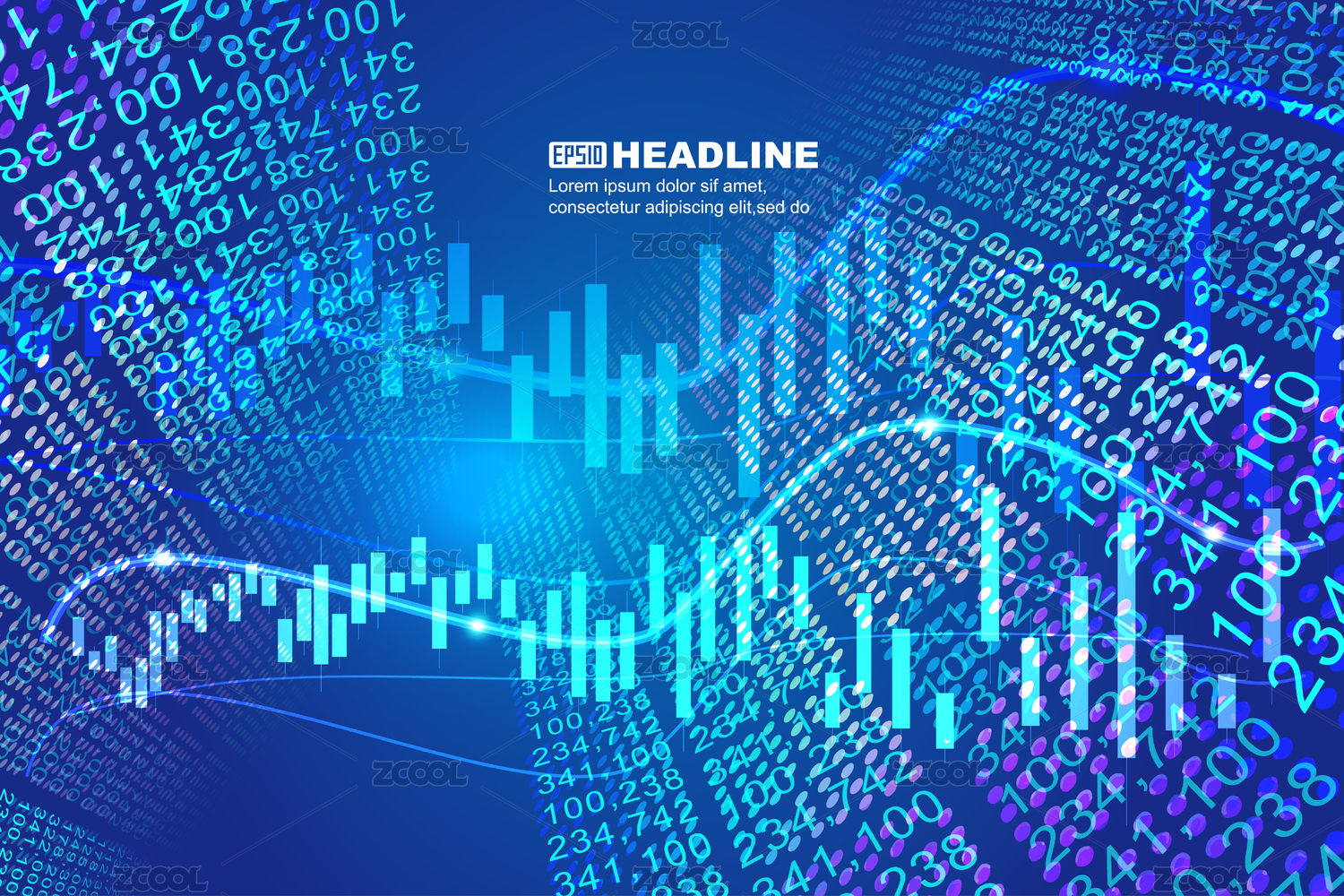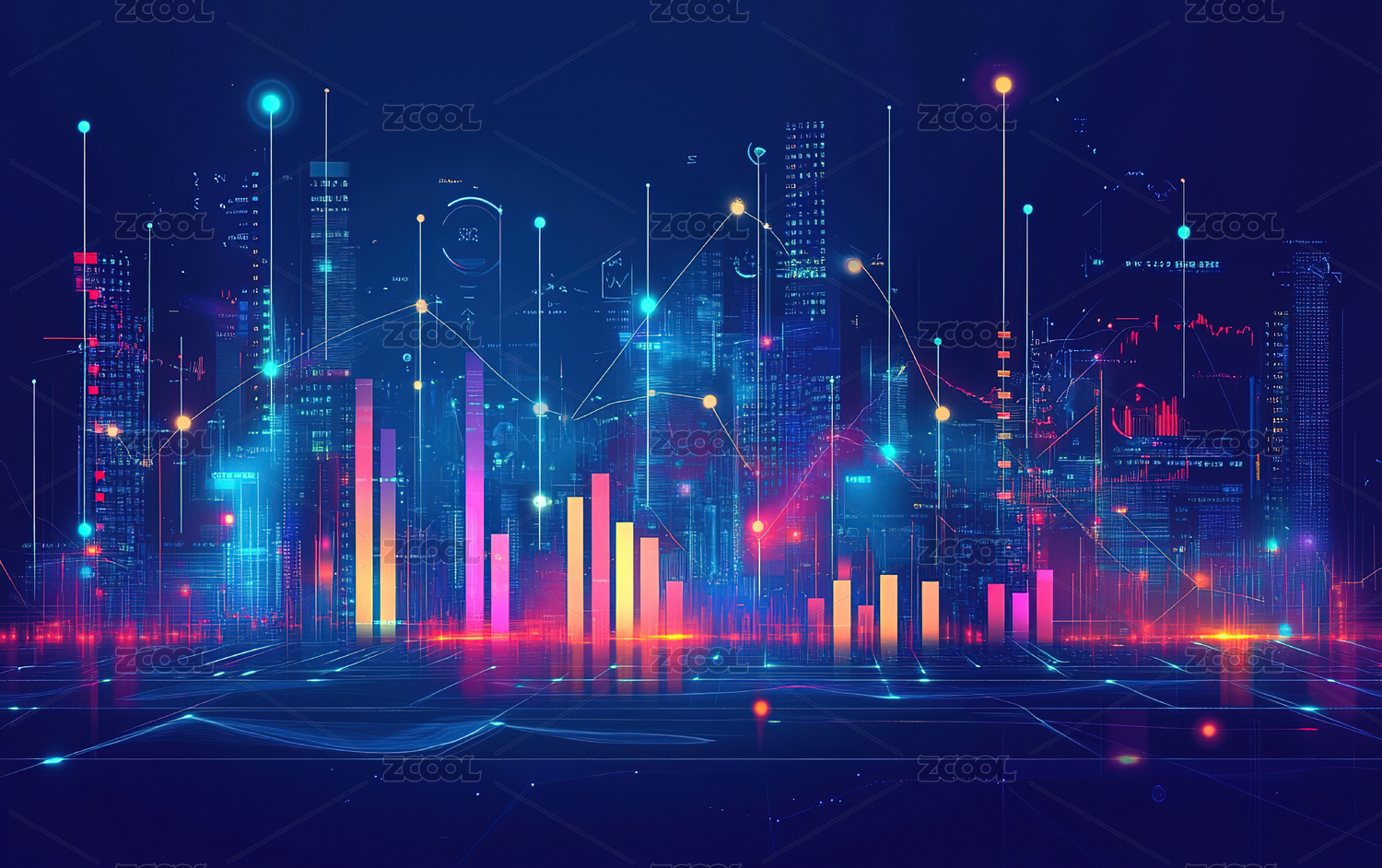 金融曲线数据图表与霓虹像素建筑矢量背景