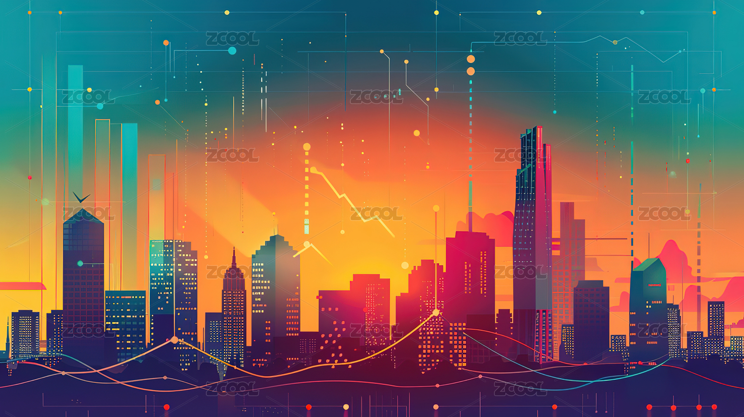 点线地球下金融曲线图表与城市建筑矢量背景