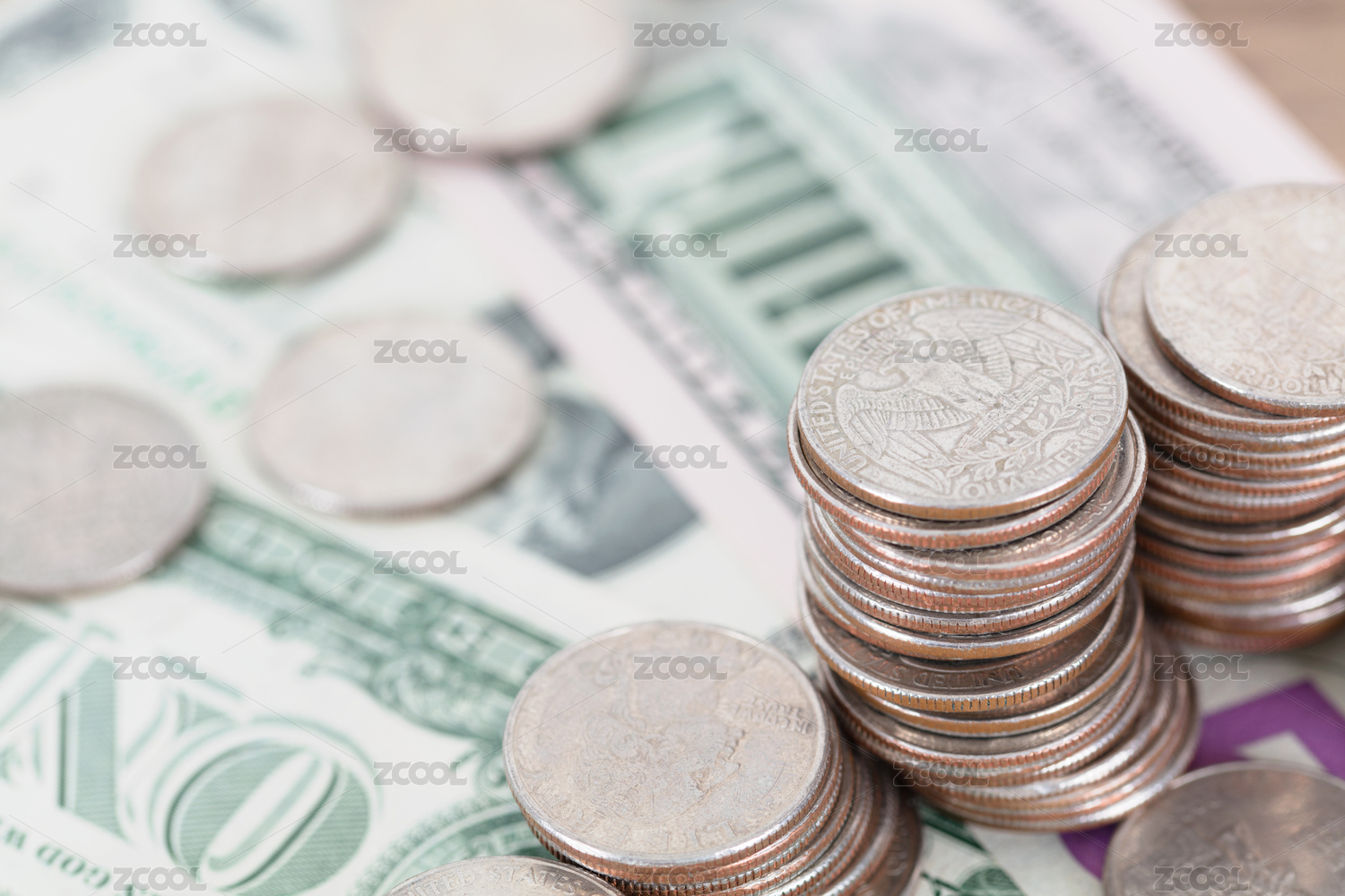 堆叠的硬币与银行卡、信用卡放在铺开的美金上