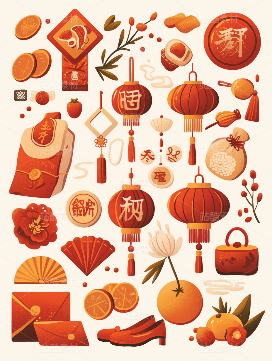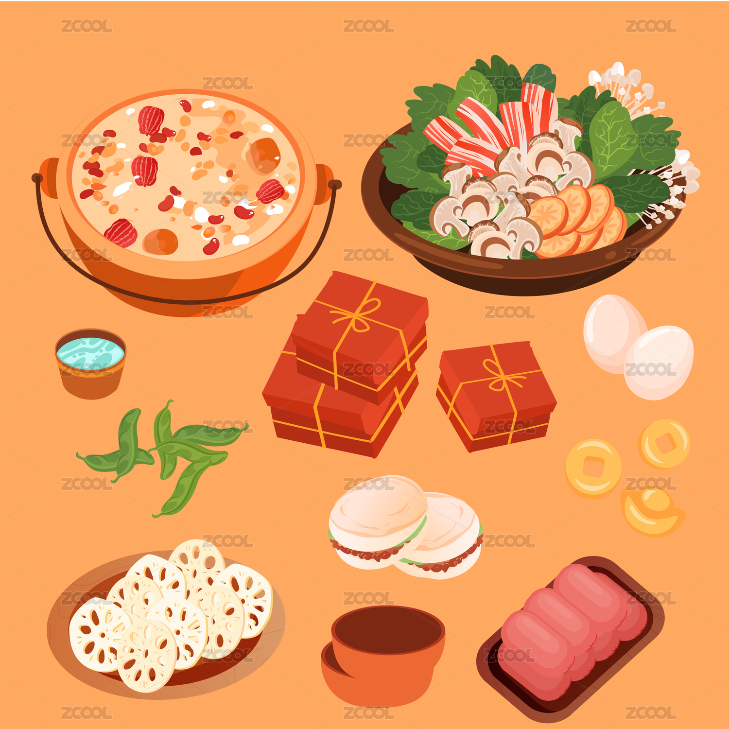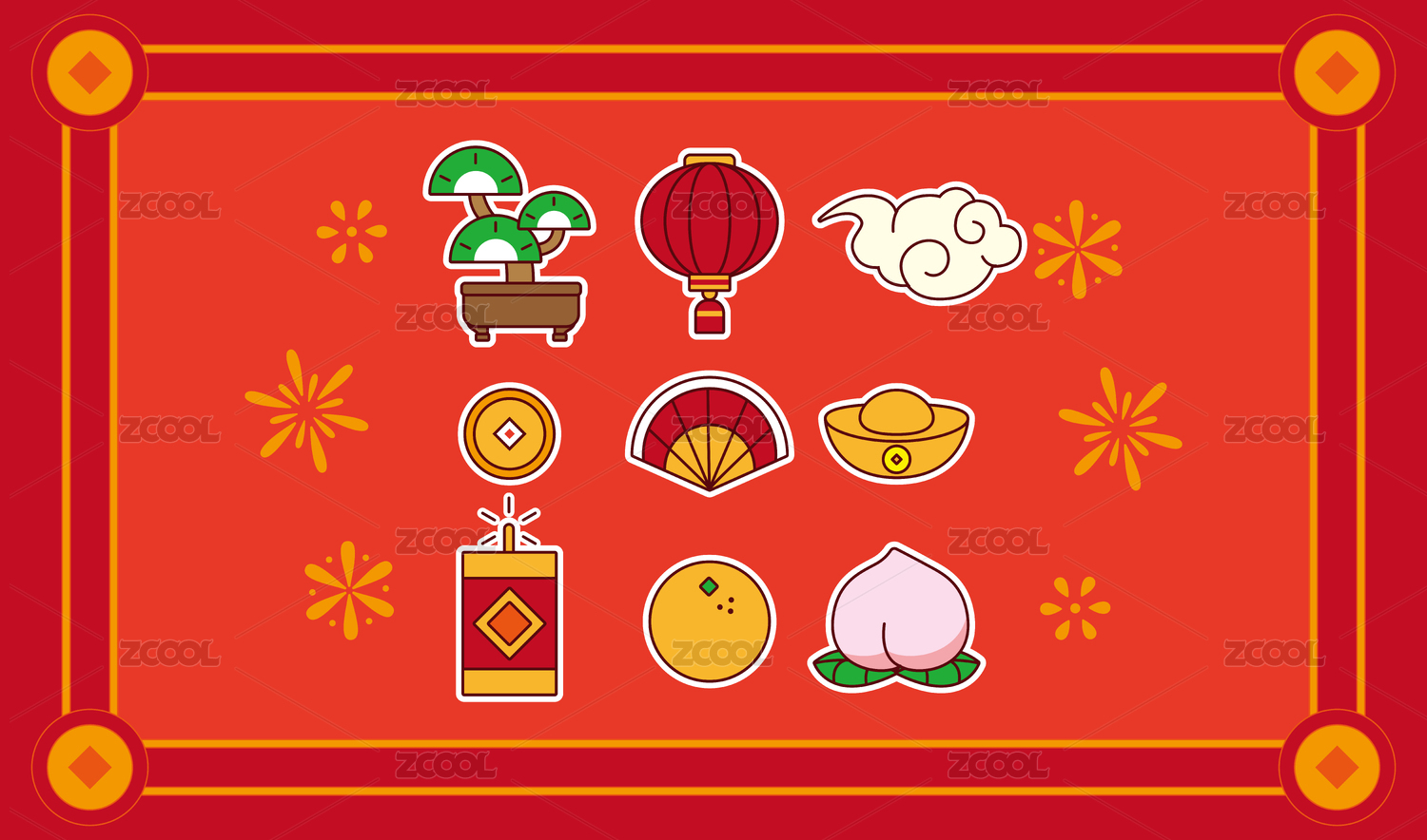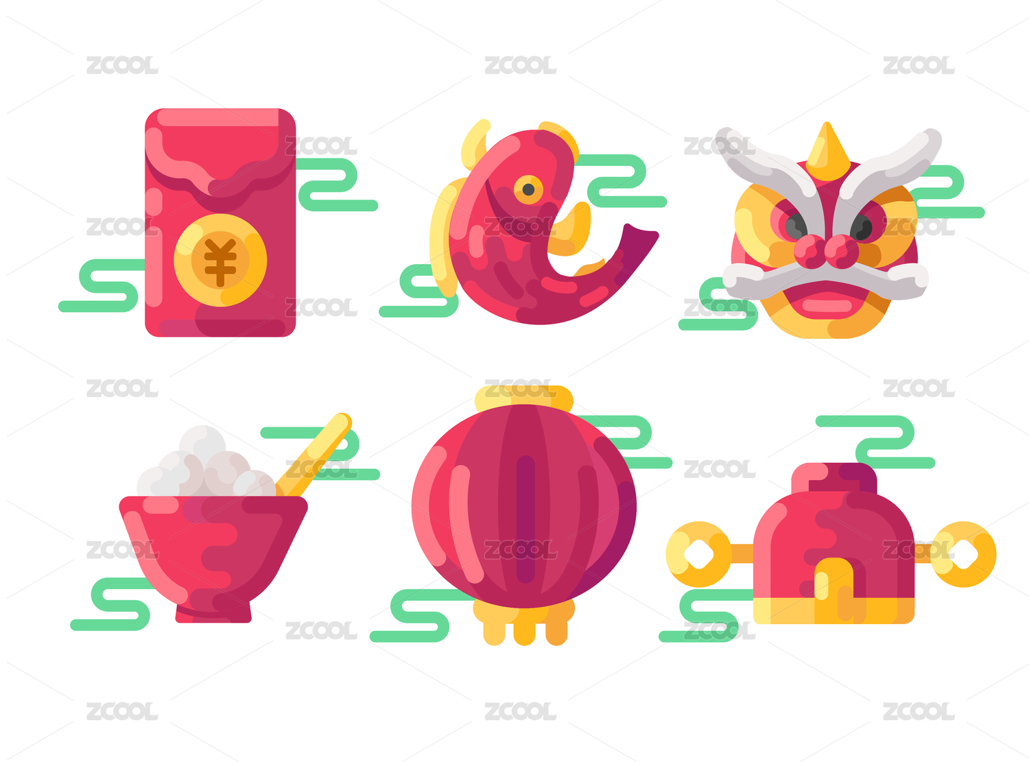 春节节日图标六组红包图标锦鲤图标舞狮图标灯笼图标财神图标汤圆图标矢量插画