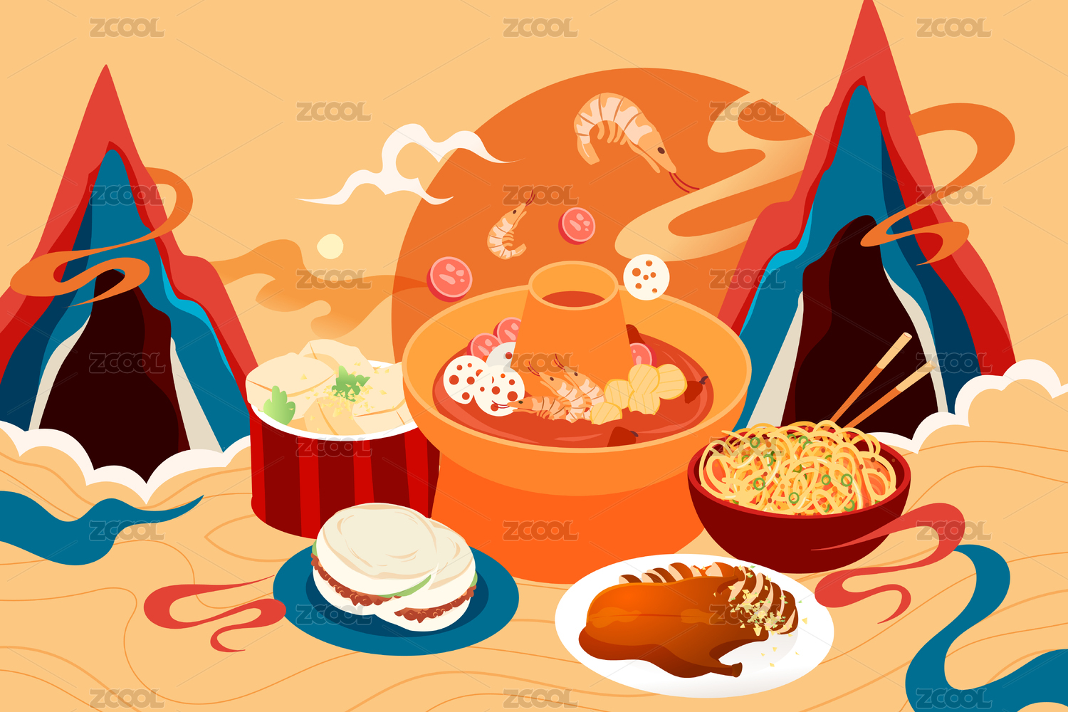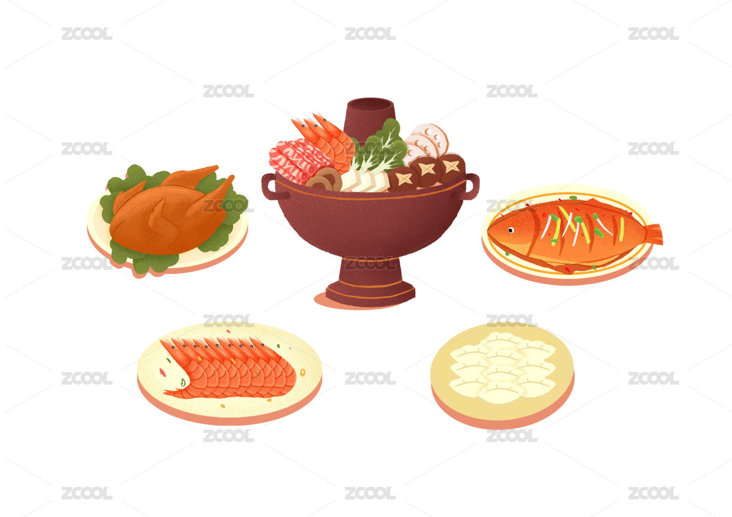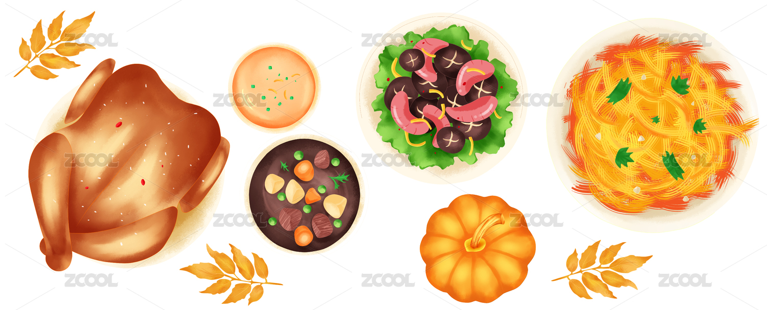 感恩节餐桌上摆放着各种秋季时令美食插画