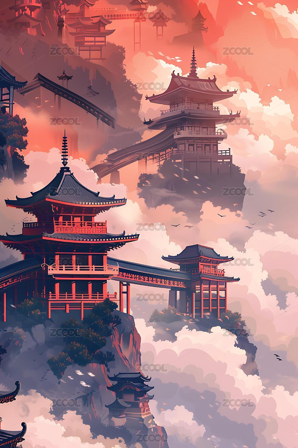 宝塔,背景,插画,风景,佛教,古建筑,国潮,国风,杭州,杭州西湖