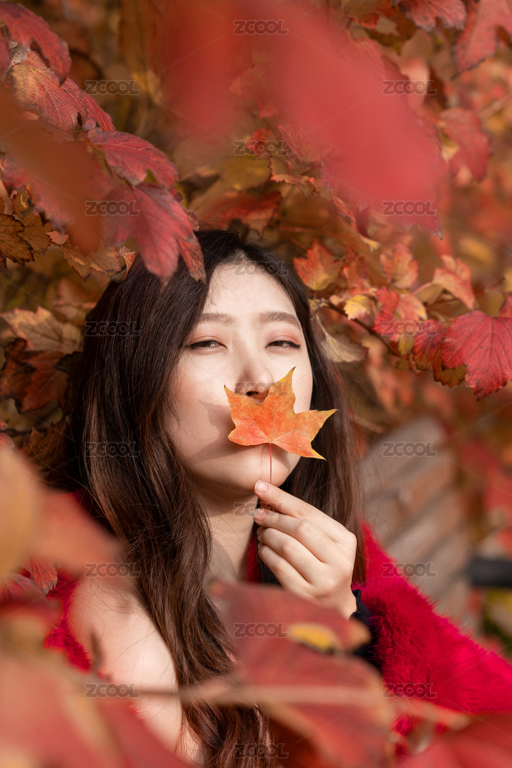 中国美女秋天拿着红色枫叶赏秋踏秋