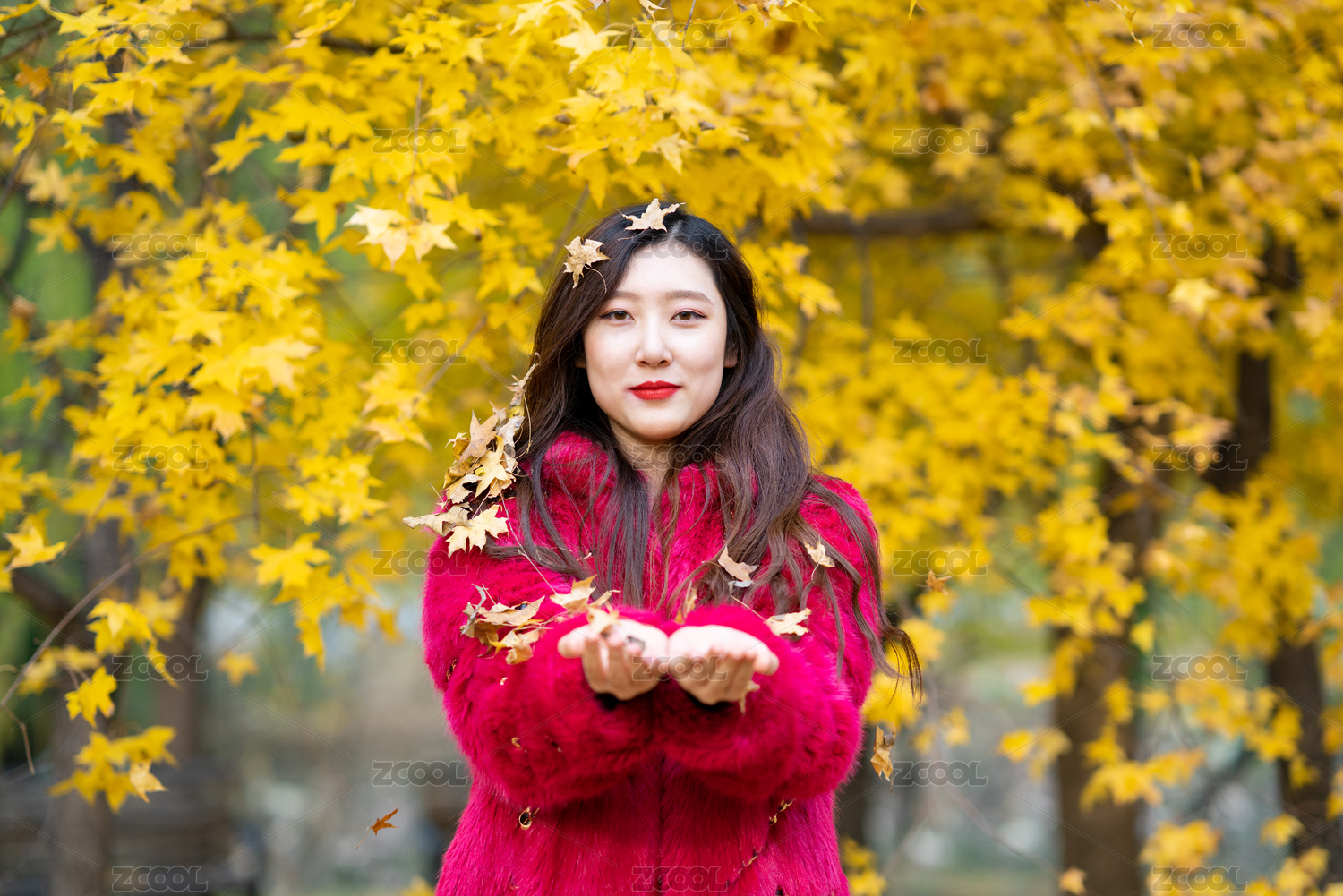 中国人,美女,女孩,女,放松,玩,手,捧着,拿着,落叶