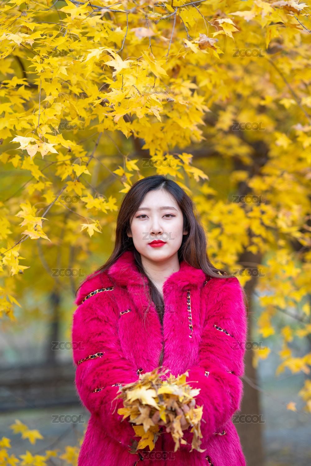 美女站在枫树下玩着秋叶落叶