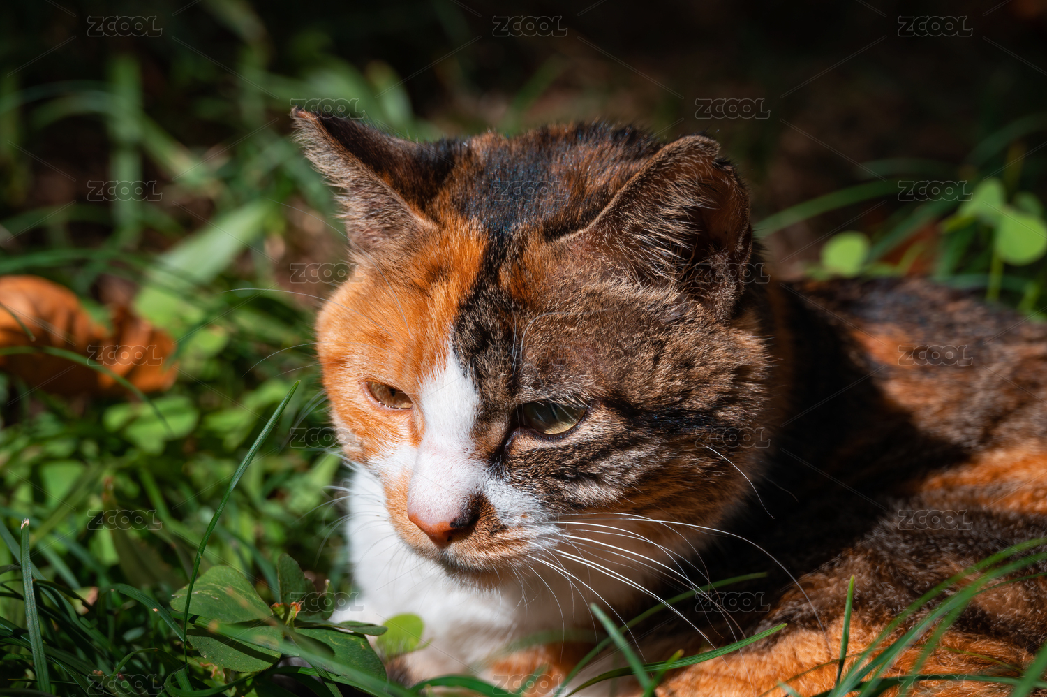 三花猫在草丛中休憩特写