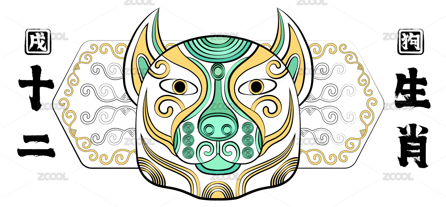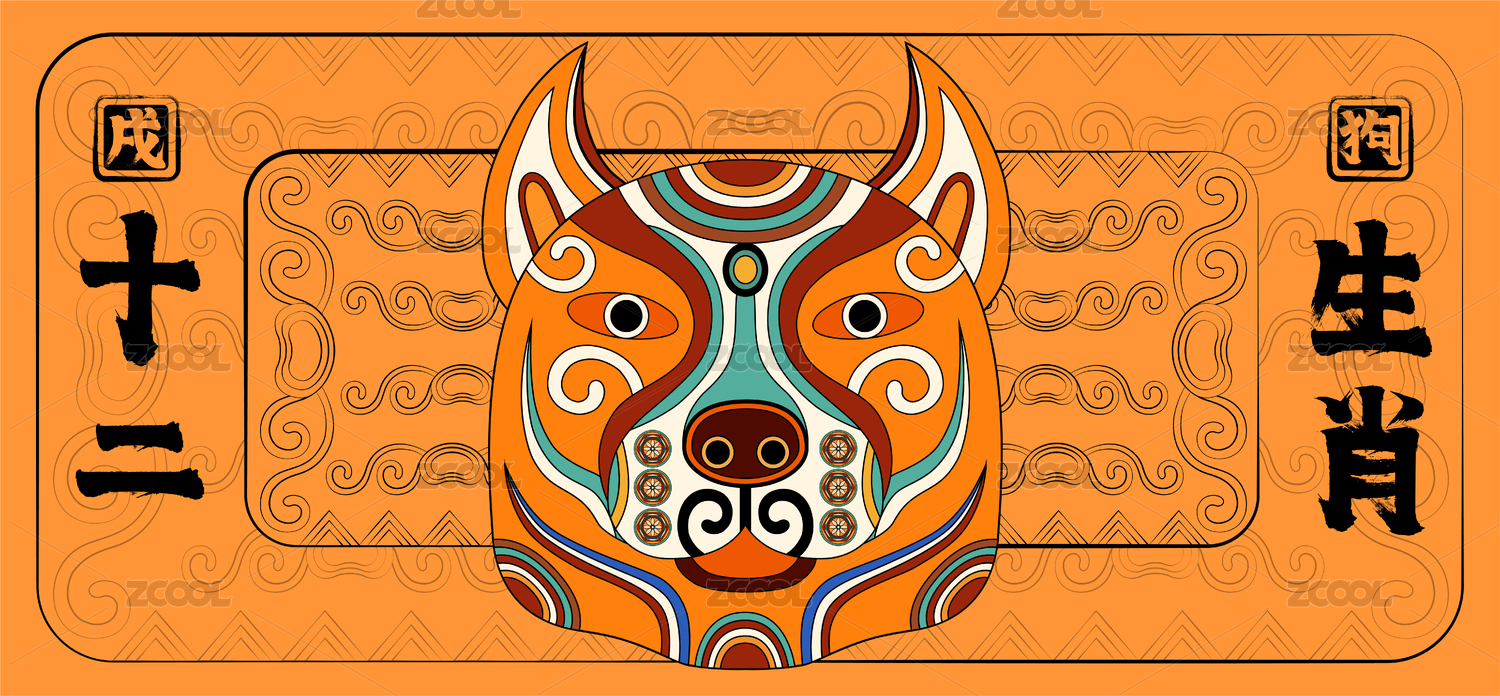 戍狗十二生肖潮流印花图案传统纹样矢量插画