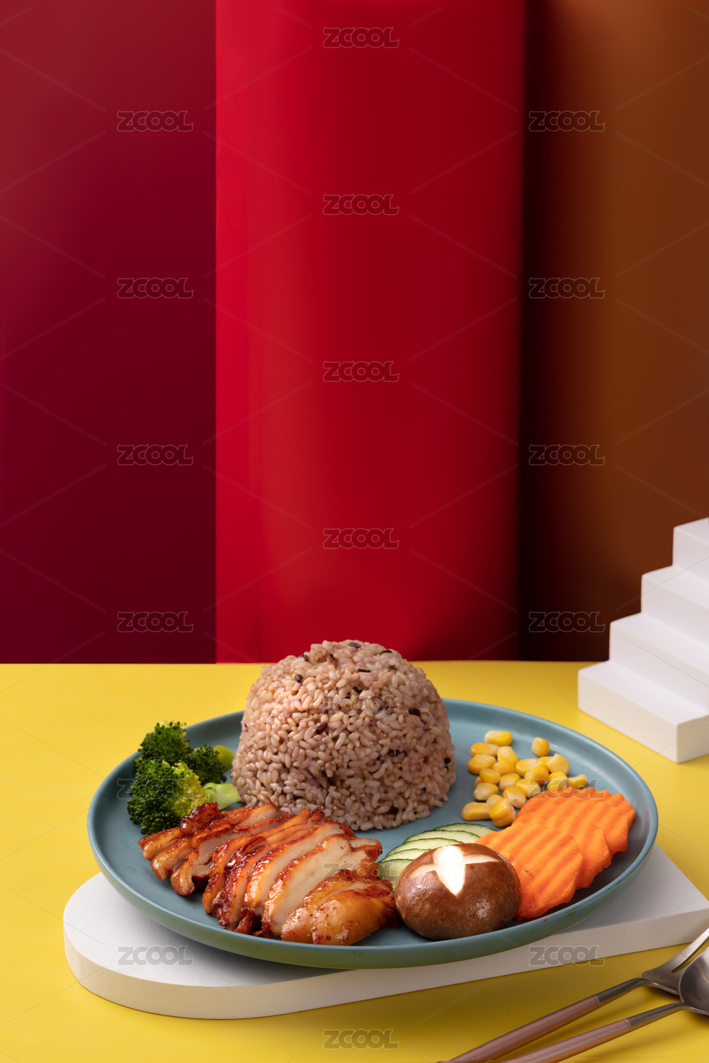 盘里的健康减肥健身运动餐叉烧鸡排糙米饭
