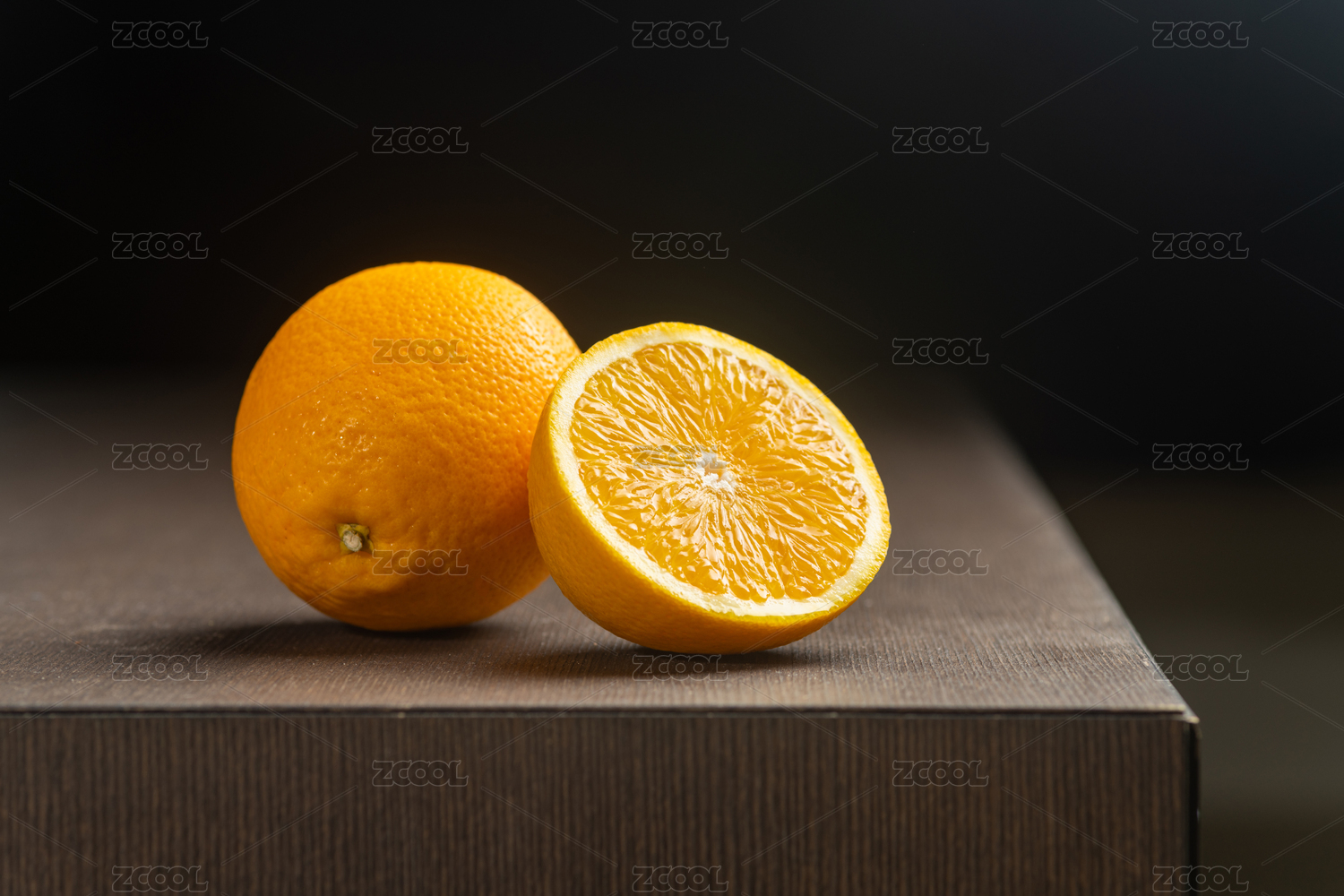 切开的橙子和一杯橙汁摆放在木桌面上深色调