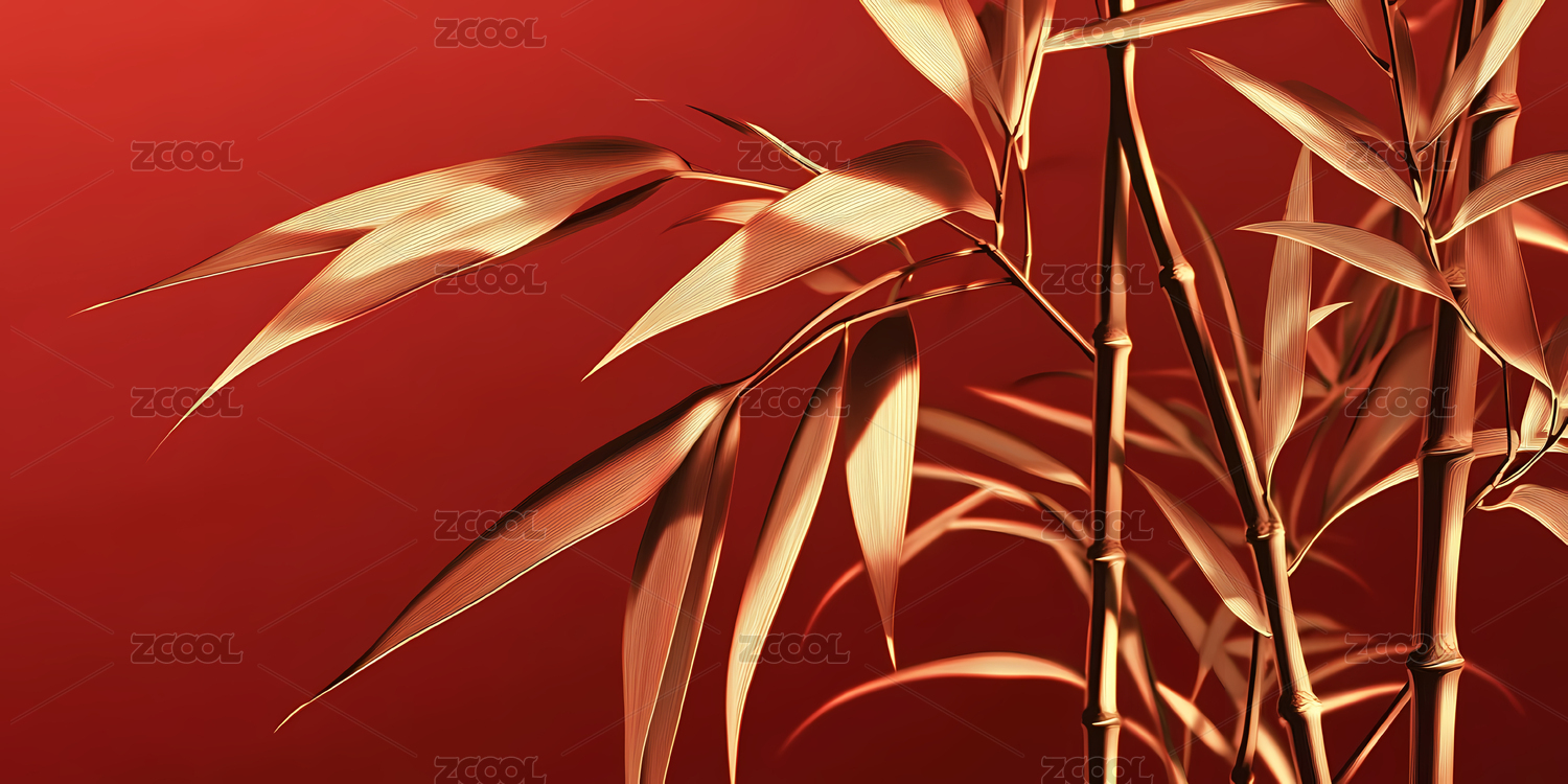 金色竹叶在红色背景下的艺术呈现