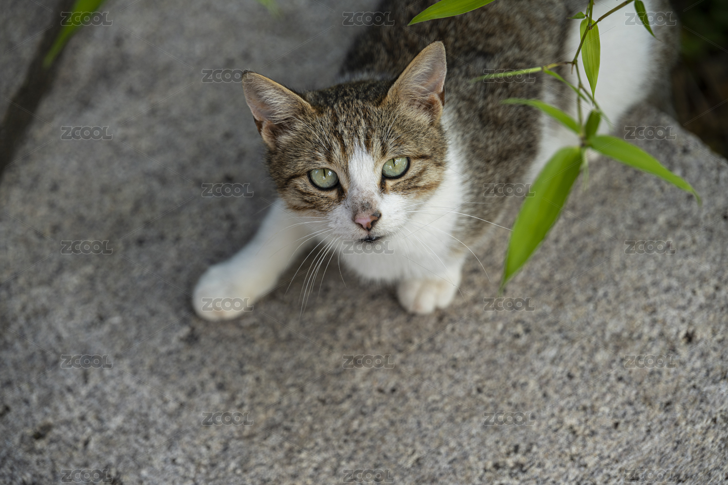 户外路面上流浪的可爱小猫特写镜头和绿色的背景
