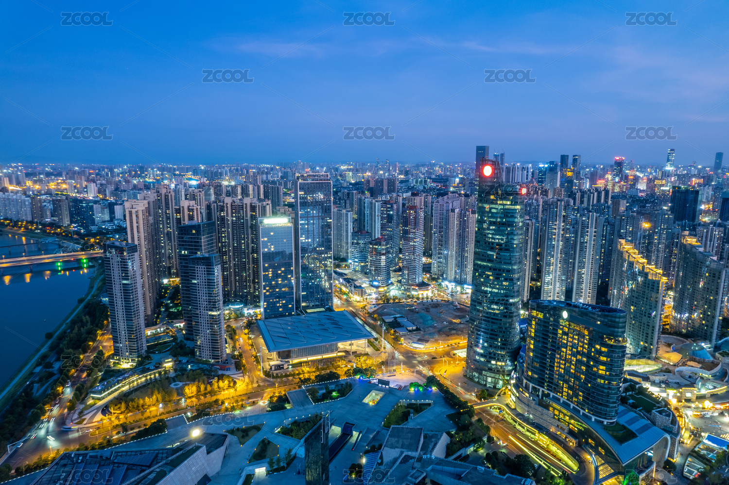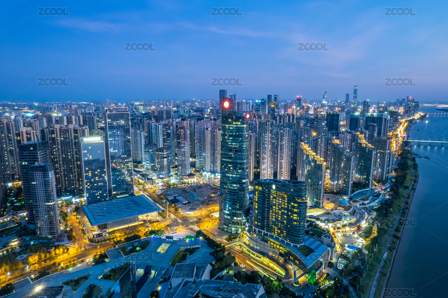 长沙滨江新城CBD湘江晚霞夜景航拍
