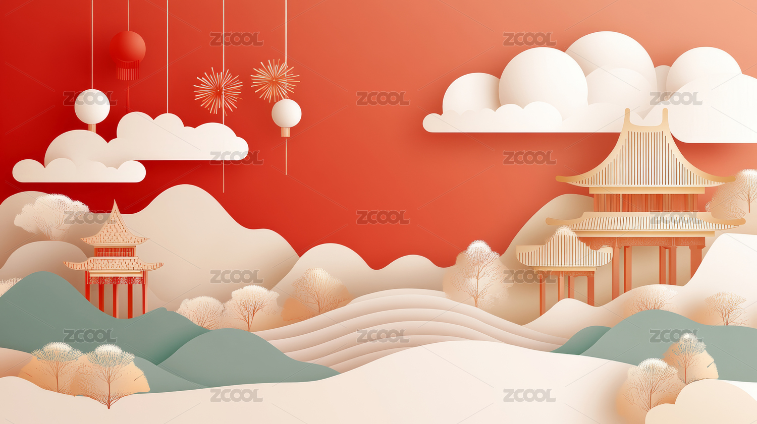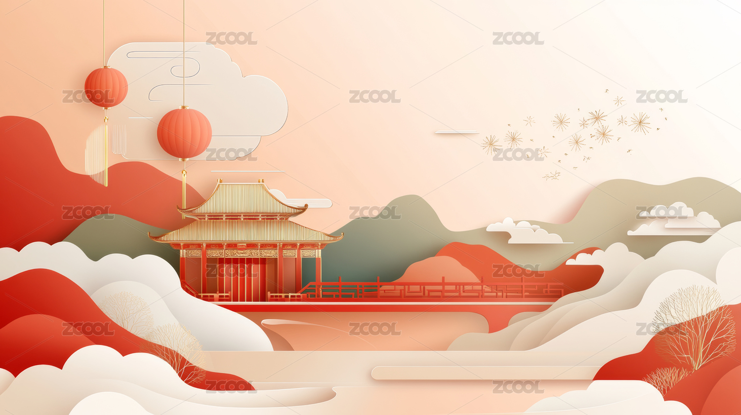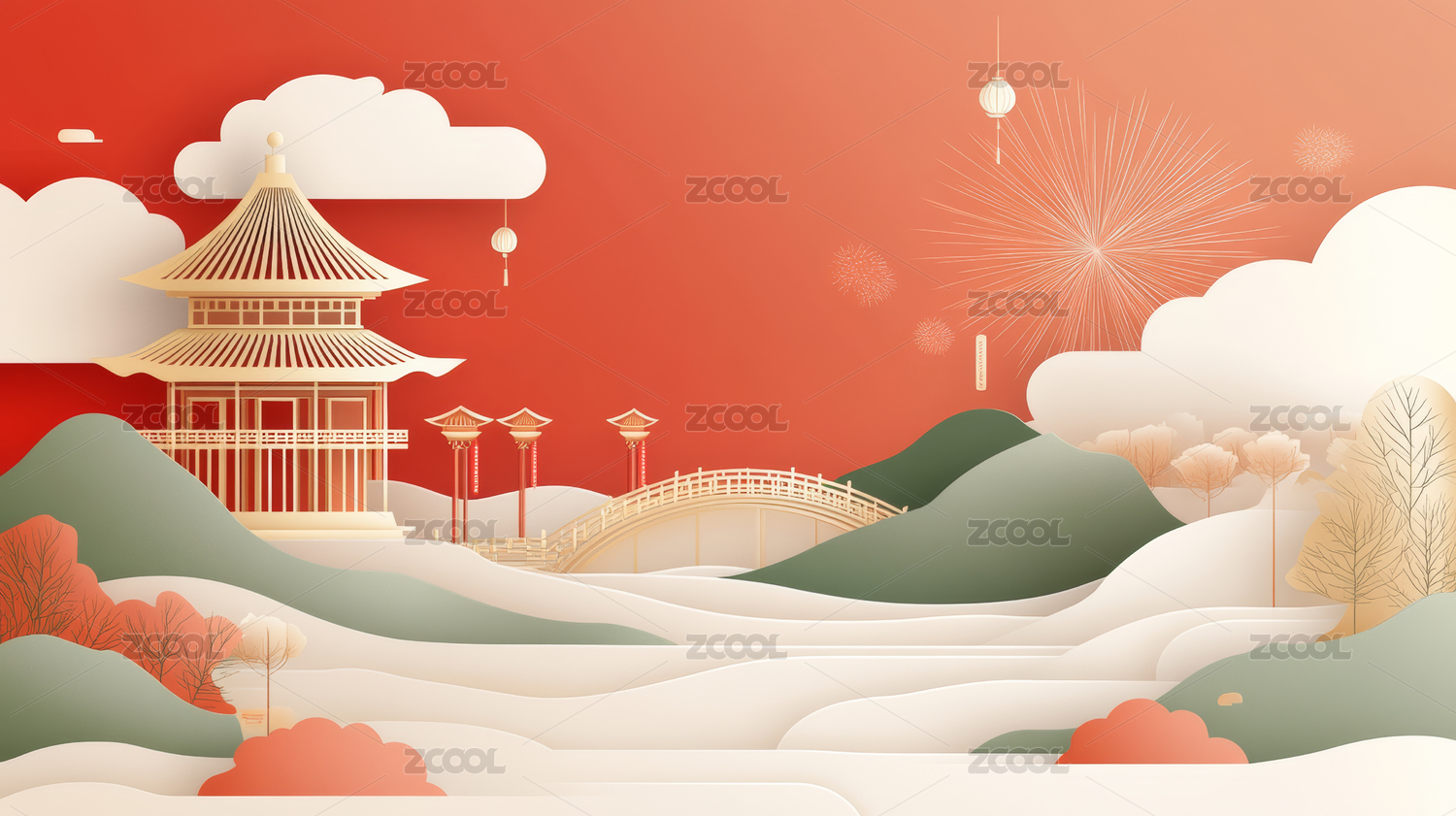 中国传统建筑新年节日主题背景插画