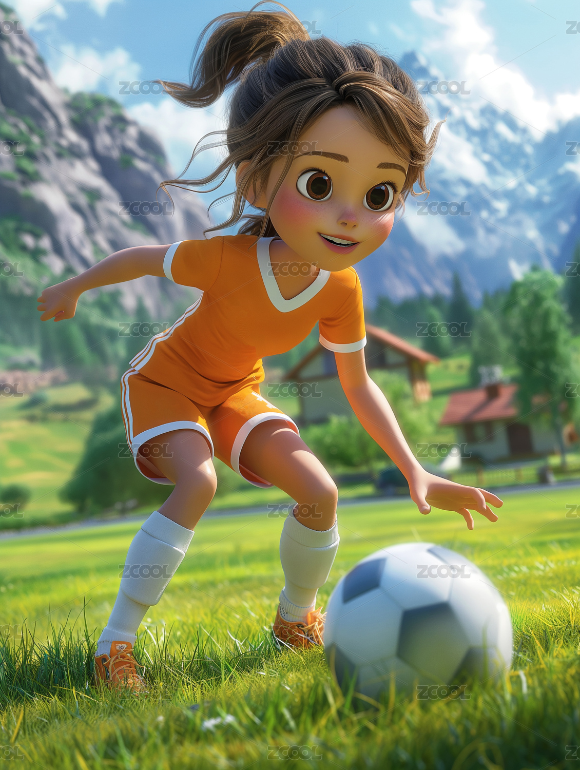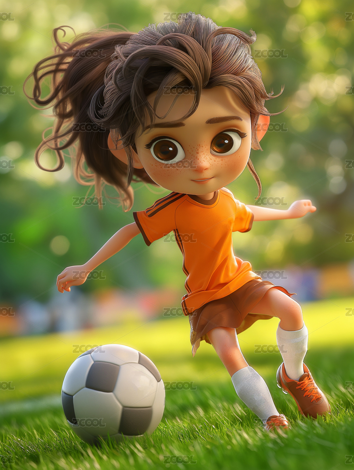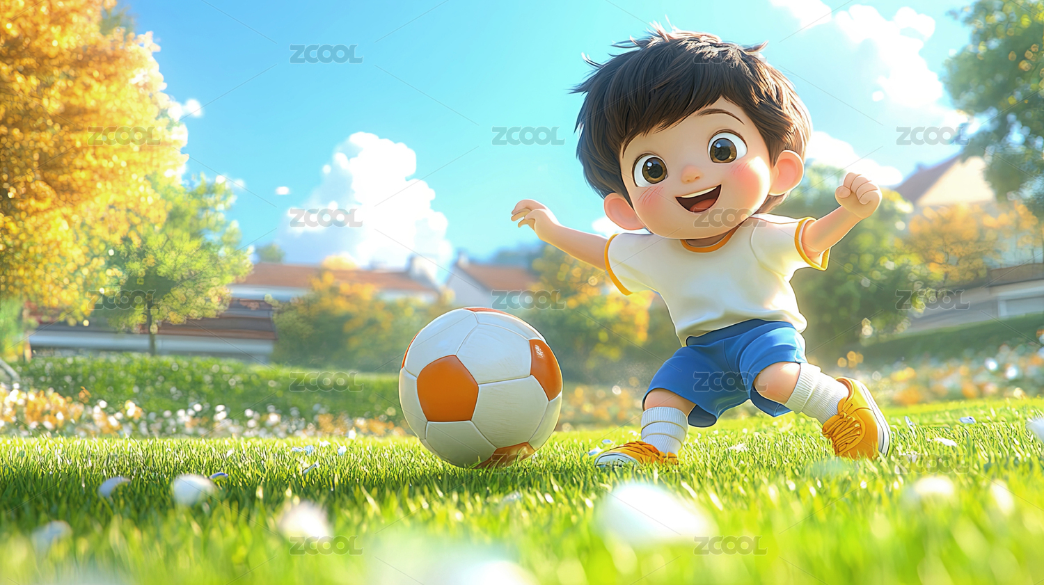 3D卡通风格,一个可爱的男生在草坪上踢足
