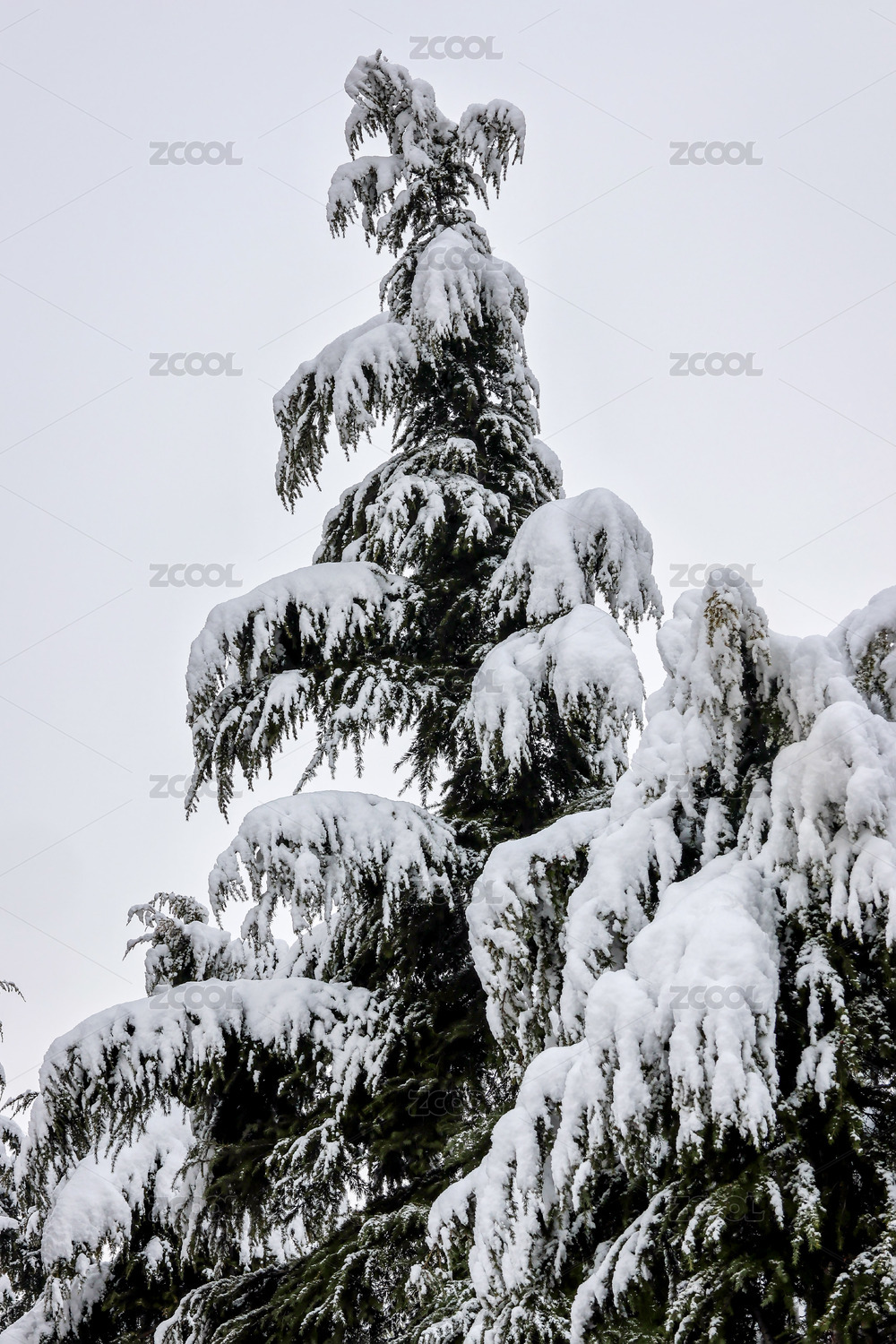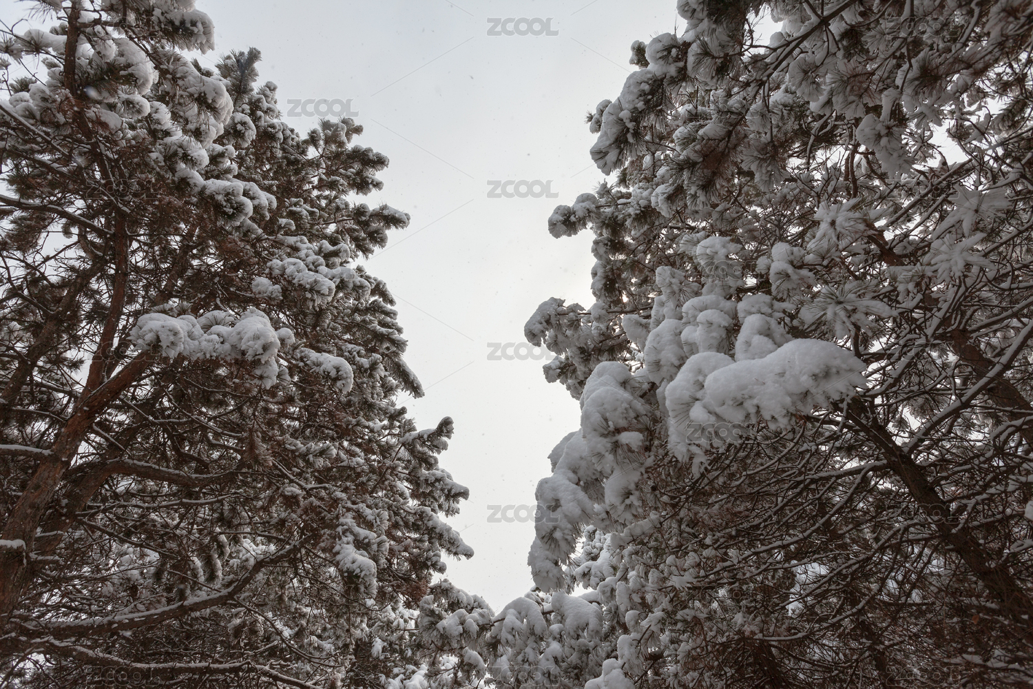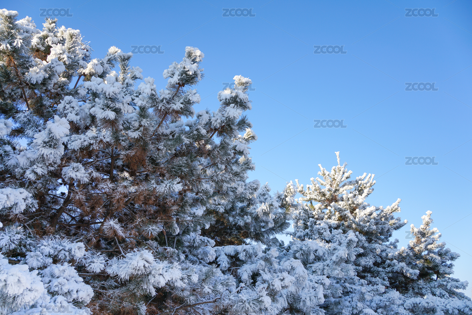 低角度拍摄冬季蓝天下的覆盖着积雪的绿色松柏