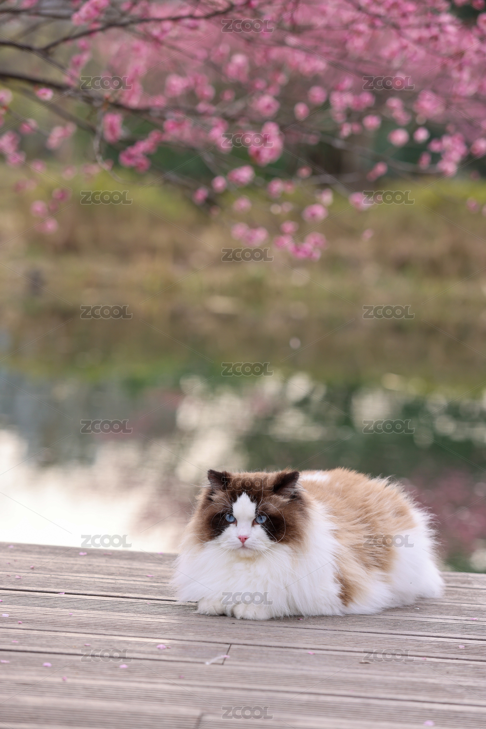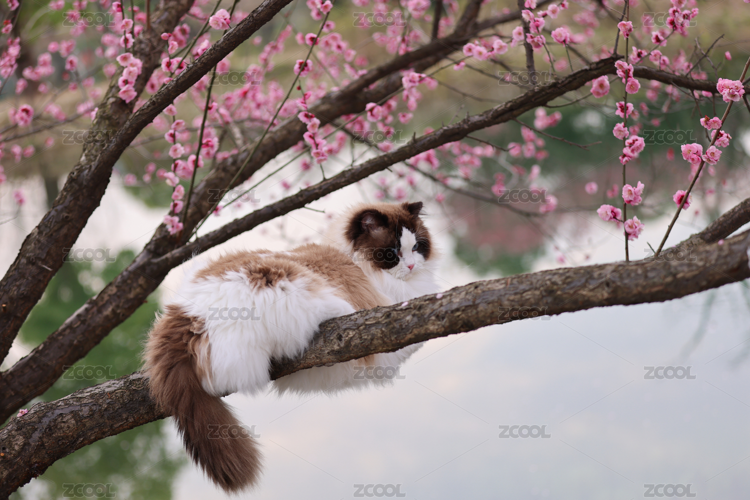 一只湖边梅花树下的海豹双色布偶猫