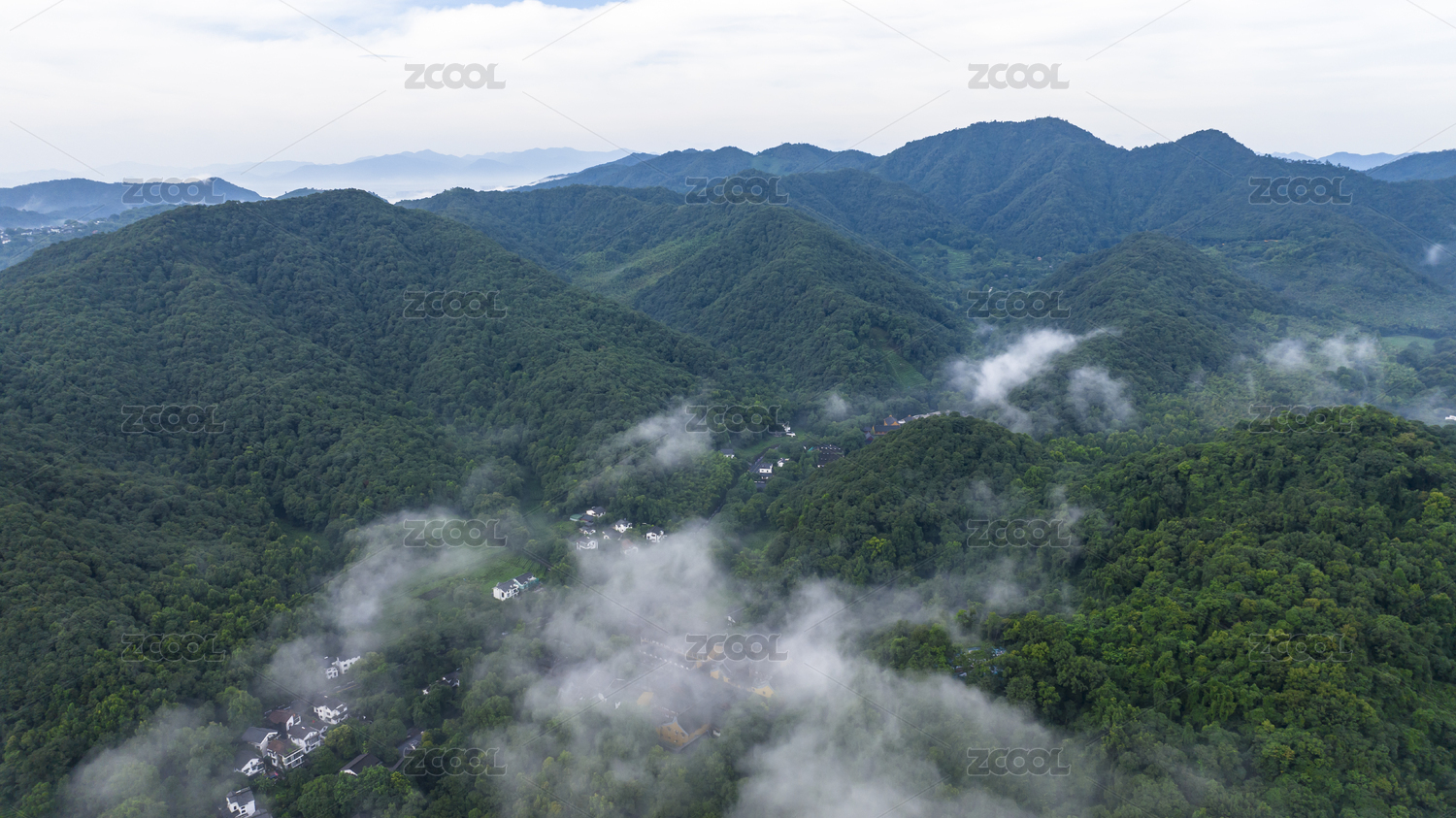 中国杭州森林氧吧云雾缭绕航拍