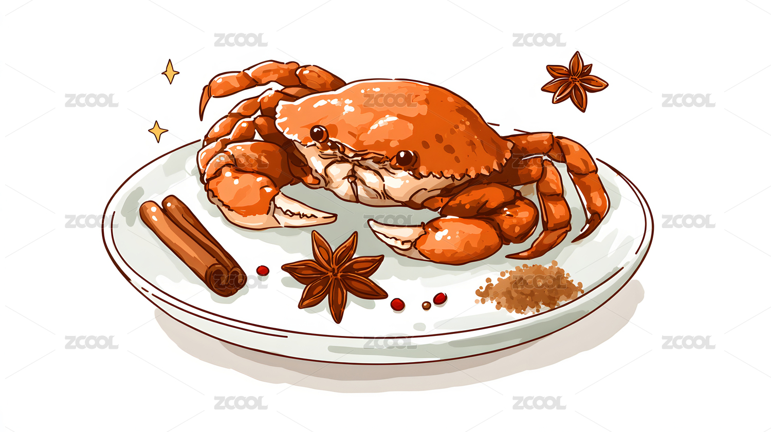 白色餐盘装螃蟹搭配八角桂皮等香料美食插画