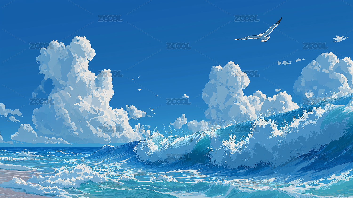 蓝天海浪云朵海鸥清新海景插画背景素材