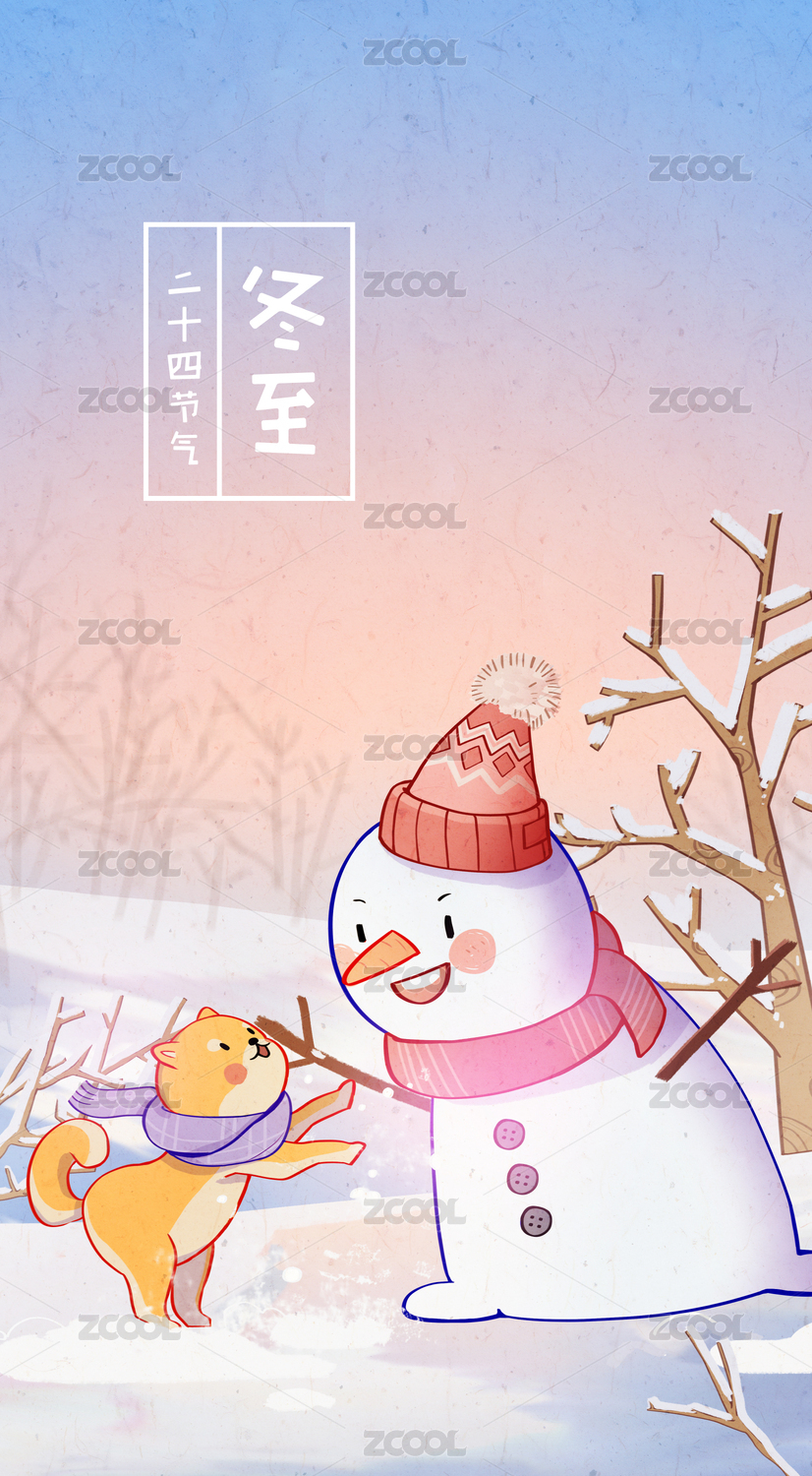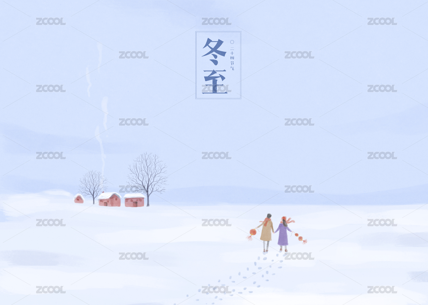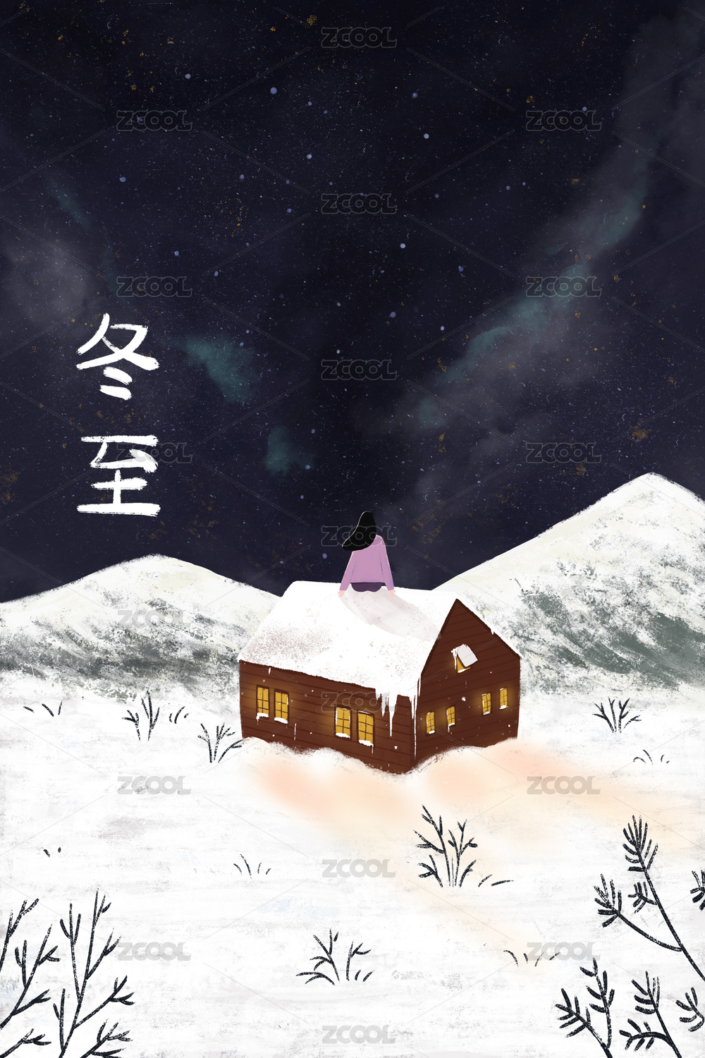 冬至节气冬天山坡后冒着炊烟的房子清新景观插画竖版字