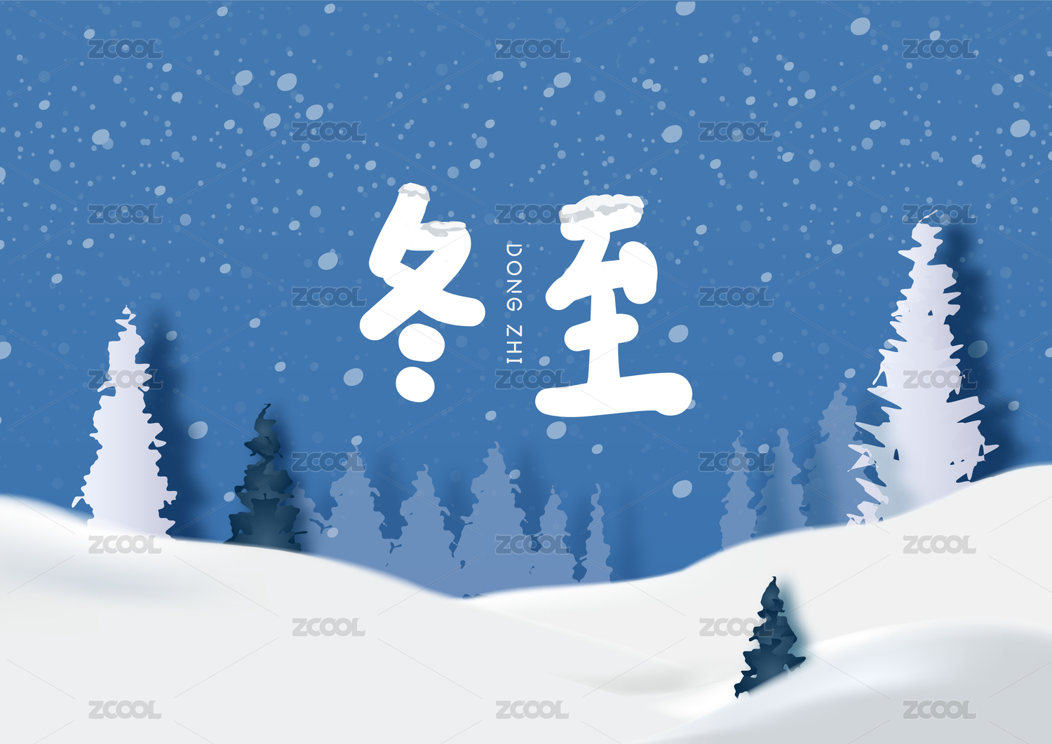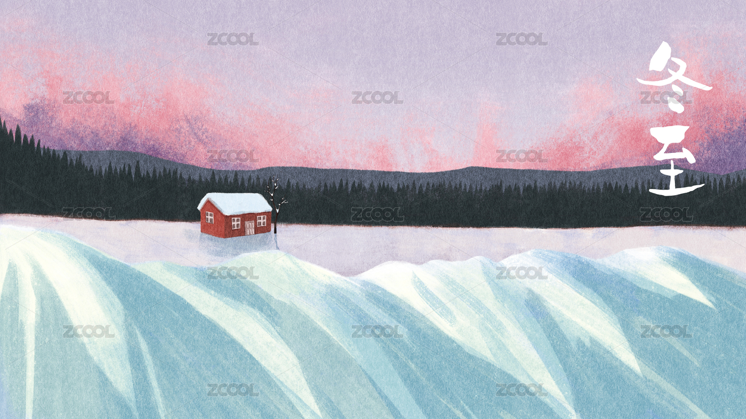 冬至节气冬天山坡后冒着炊烟的房子清新景观插画横版字