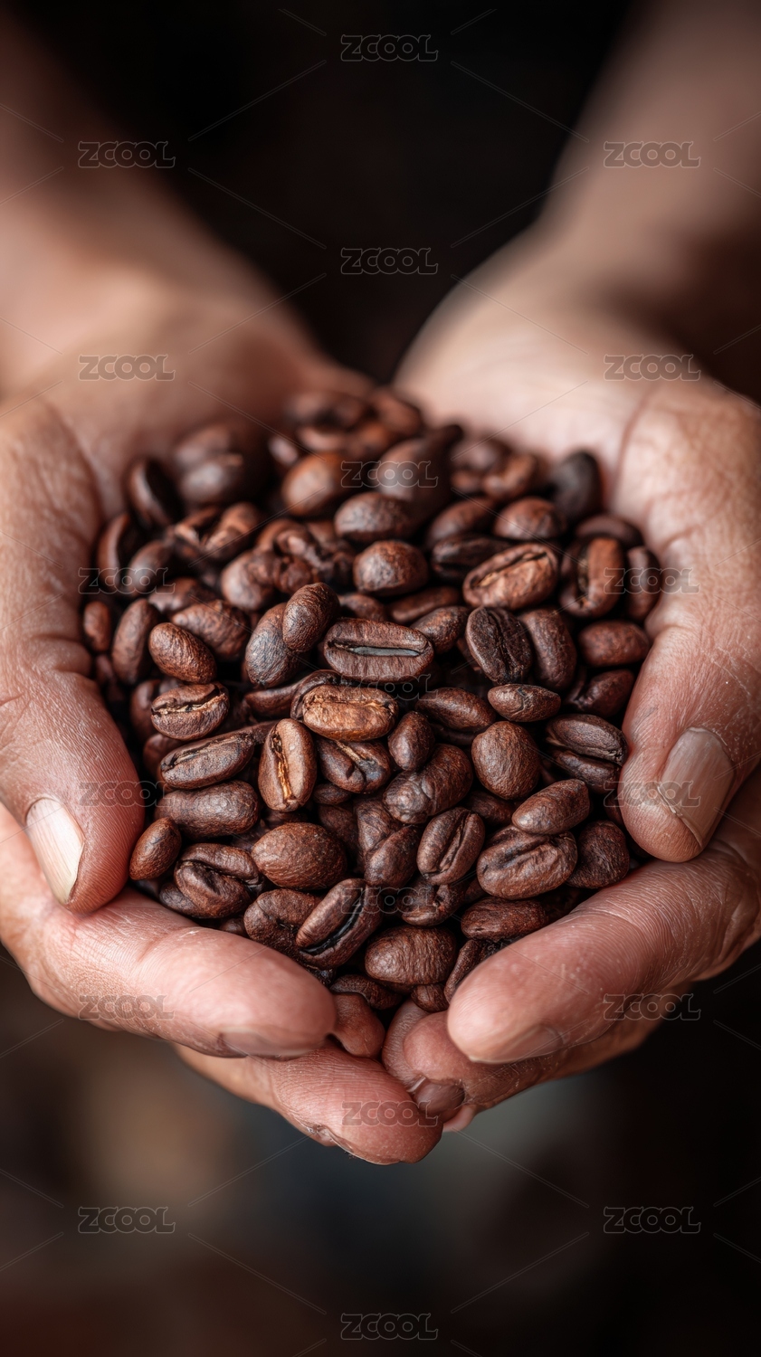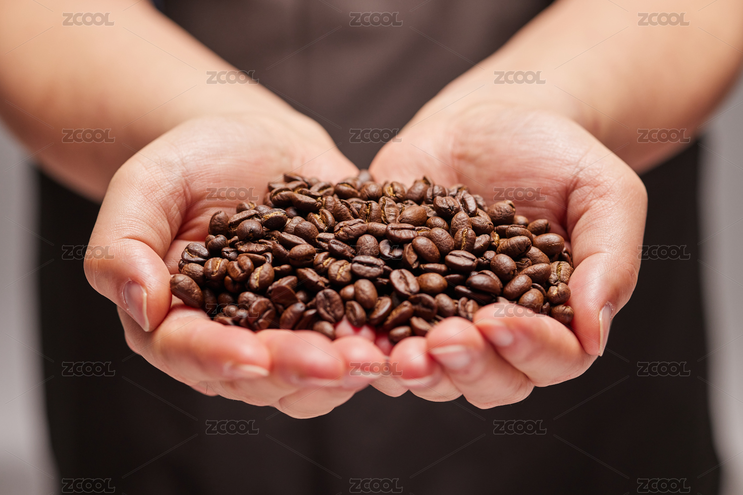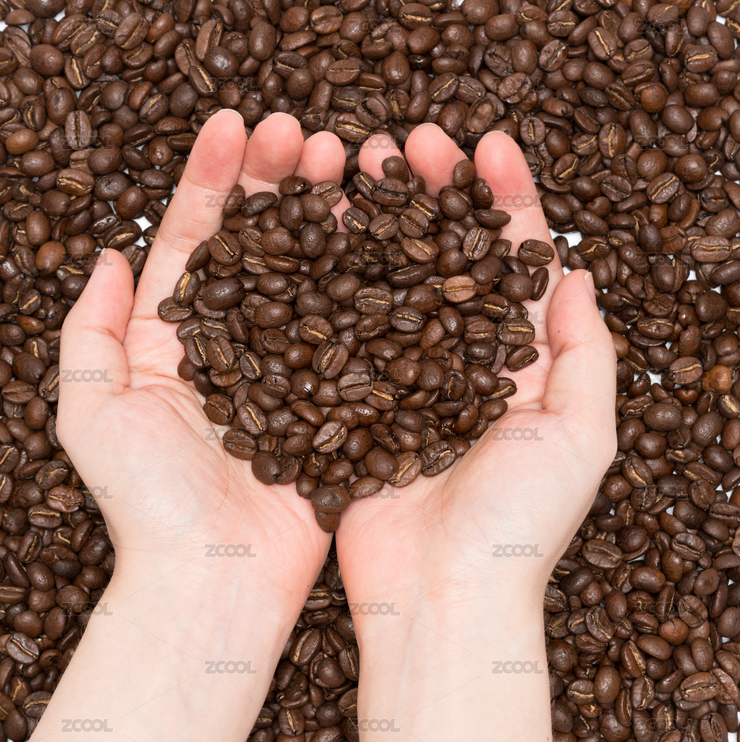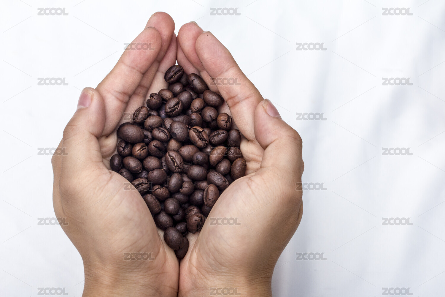 特写镜头拍摄男人的双手中捧着许多咖啡豆