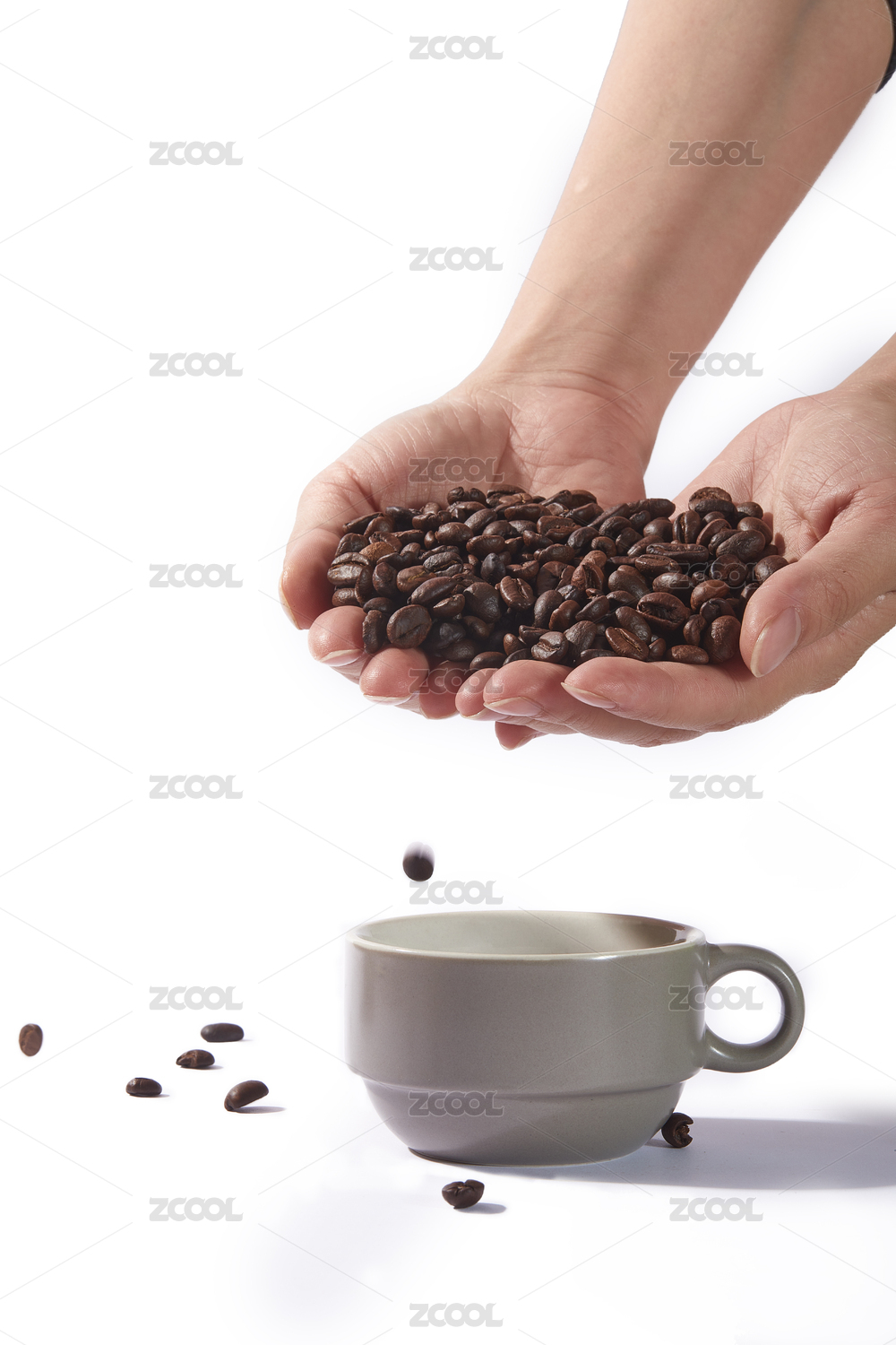 白色背景单手握咖啡杯与咖啡豆惊叹号俯视