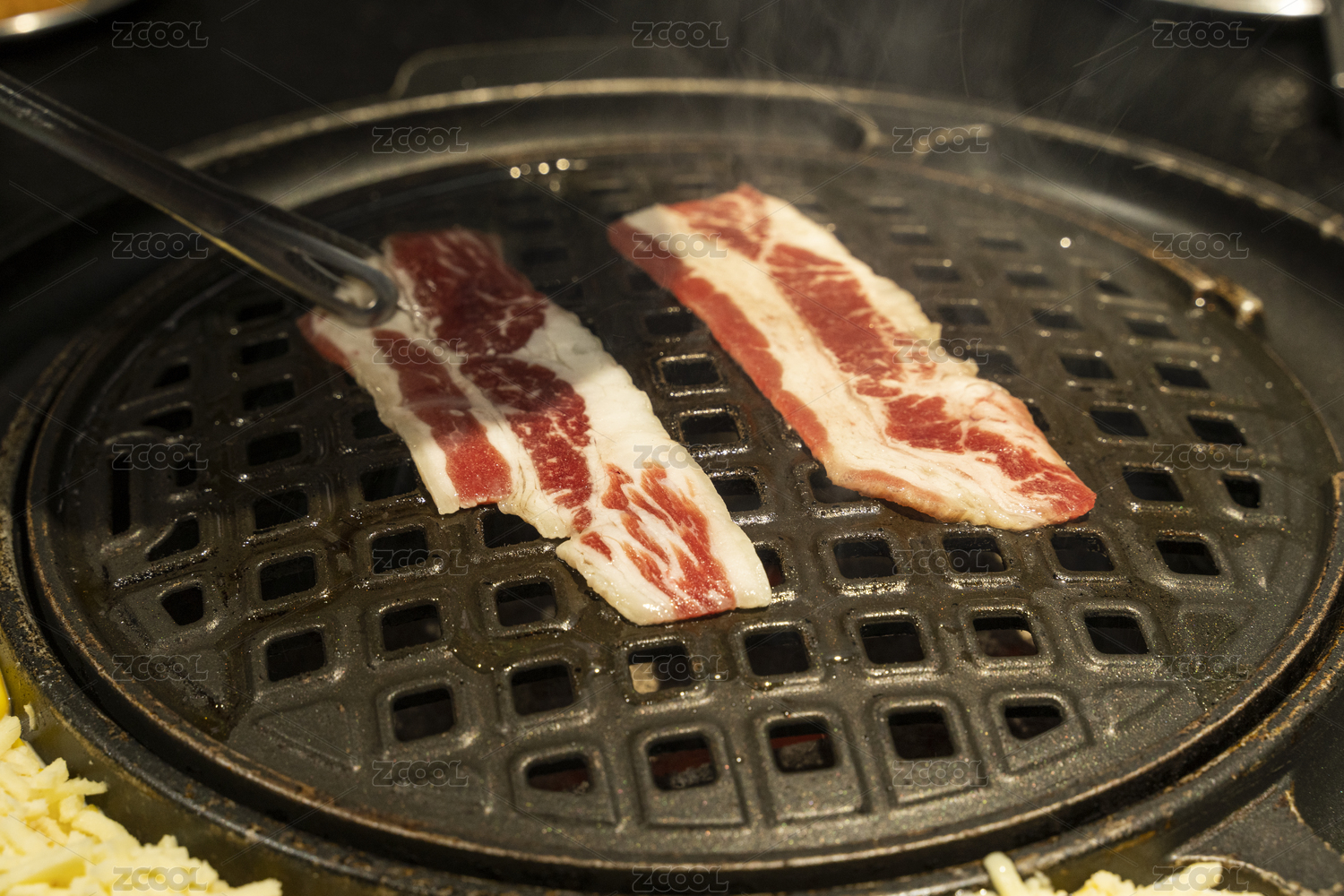 韩式烧烤烤猪五花肉夹子夹烤五花肉特写