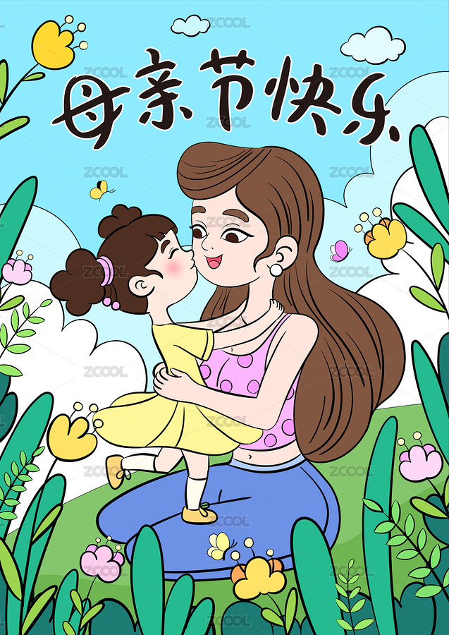 妈妈抱着小孩眼里充满爱母亲节矢量插画海报