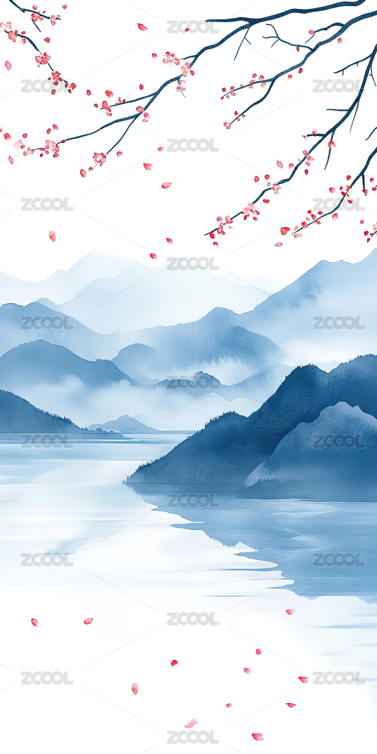 户外梅花高山湖水风景水墨插画