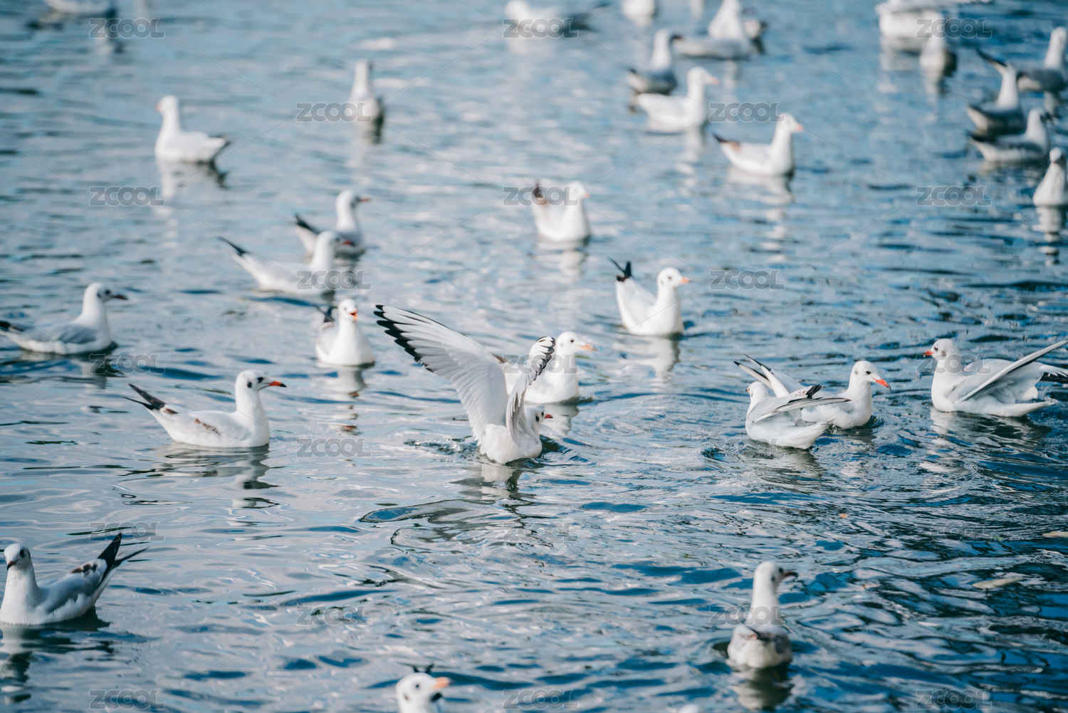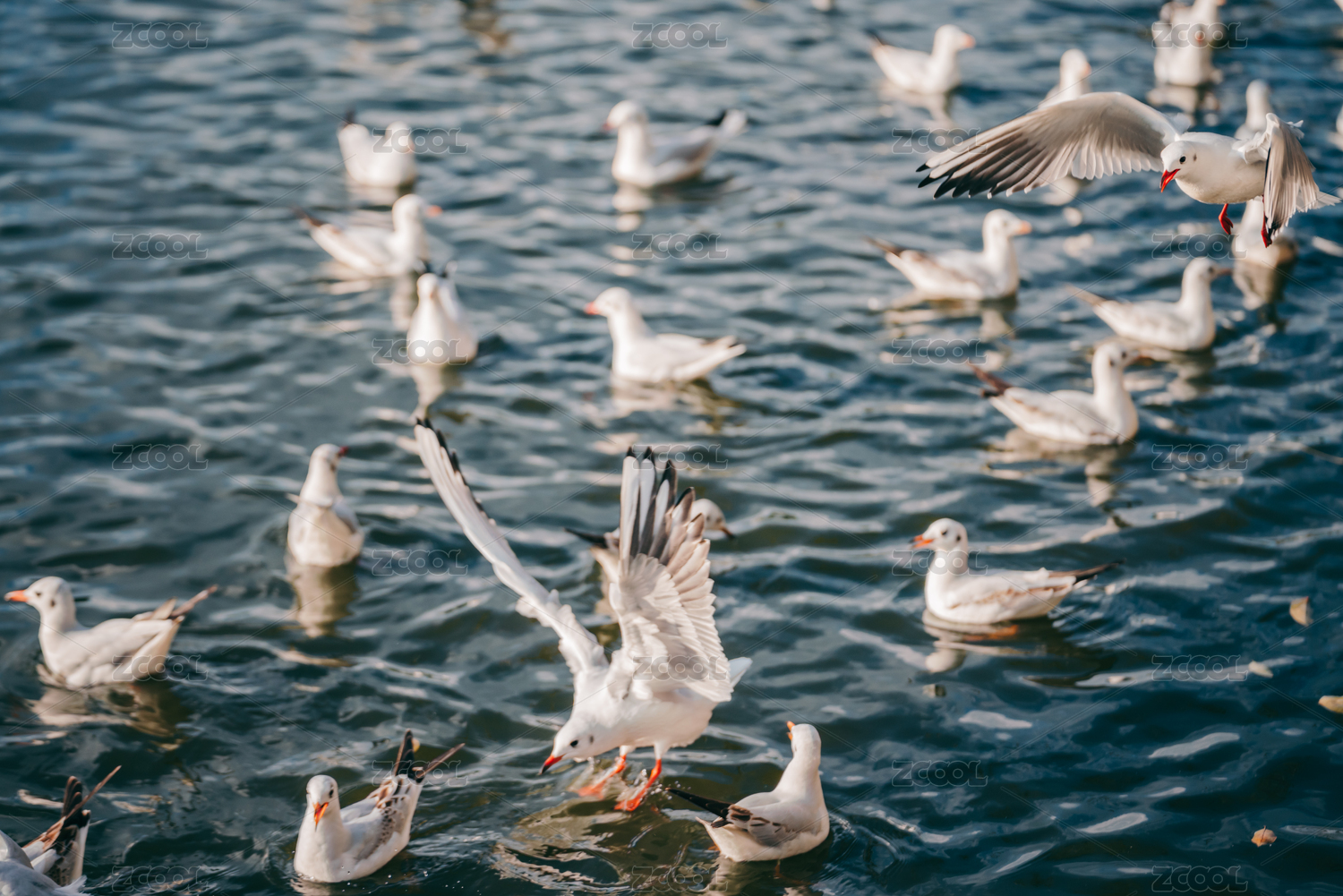 海鸥在海面上自由飞翔追逐觅食嬉戏特写