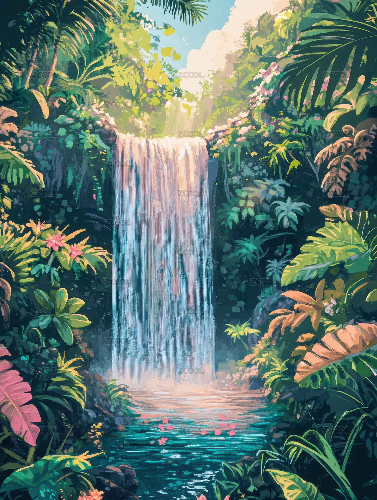热带雨林中的宁静瀑布插画
