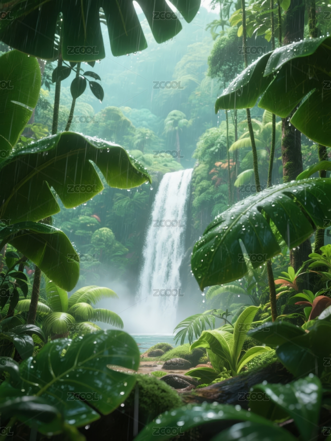 瀑布清新雨林景观场景