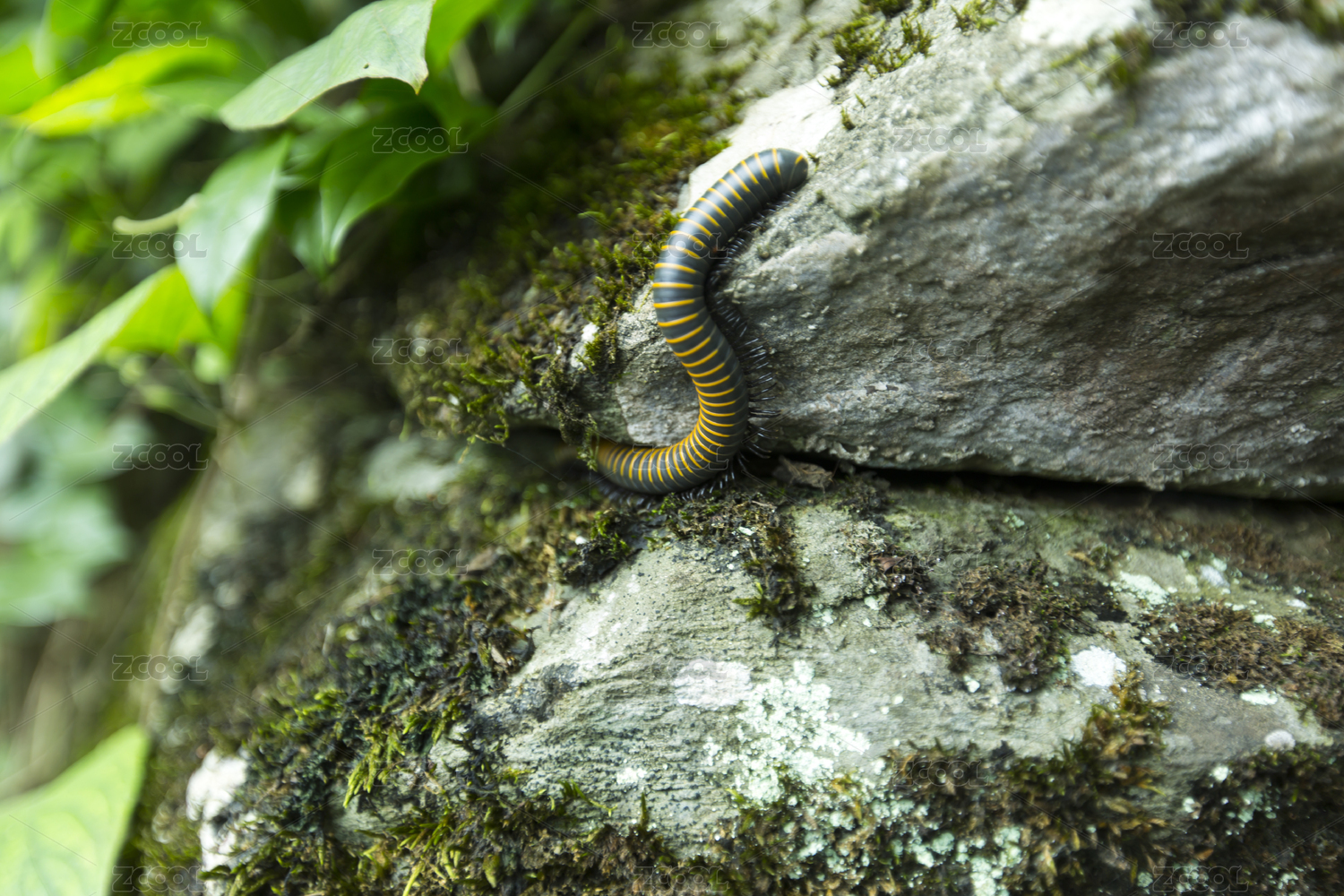 原始森林中正在石头缝隙中爬行的千足虫
