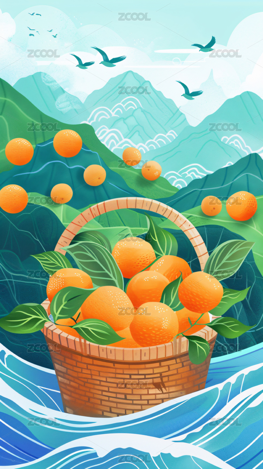 图像,国潮风,插画,AIGCFG,新中式风格,水果,绿色,自然,篮子,收获