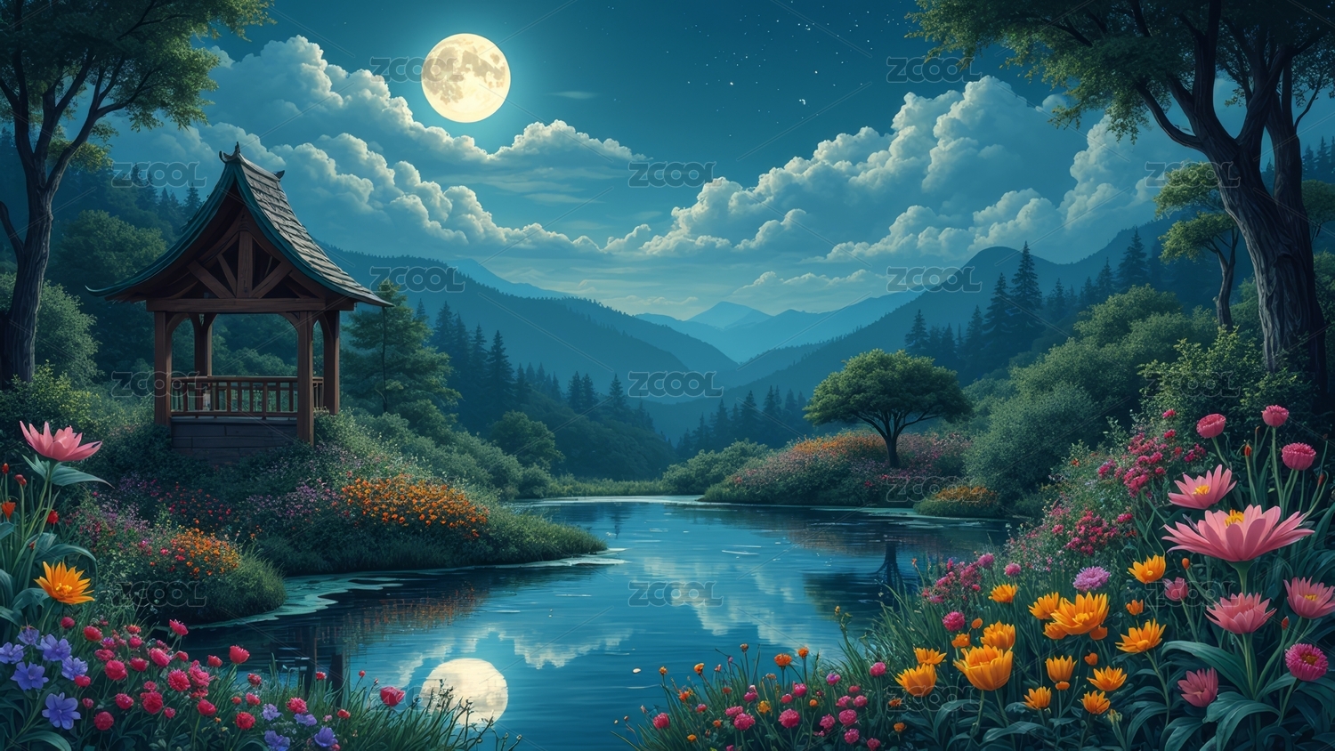 古风湖月夜景插画