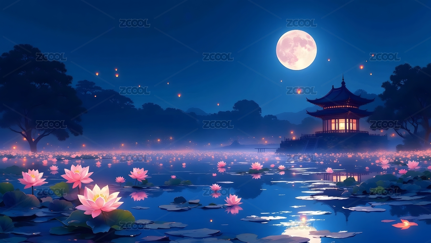 月夜荷花池与亭阁