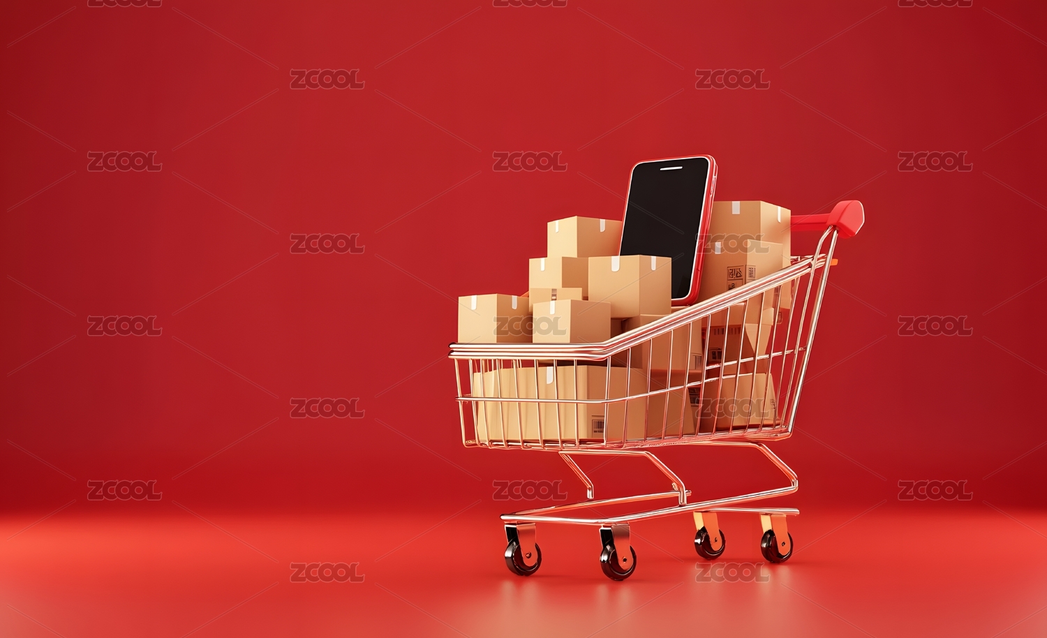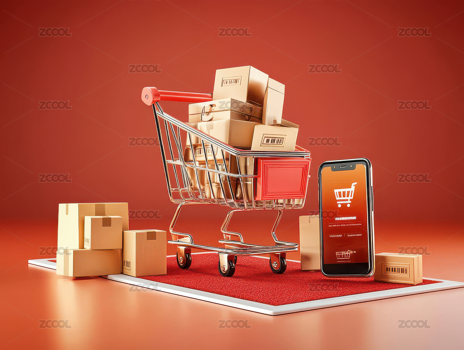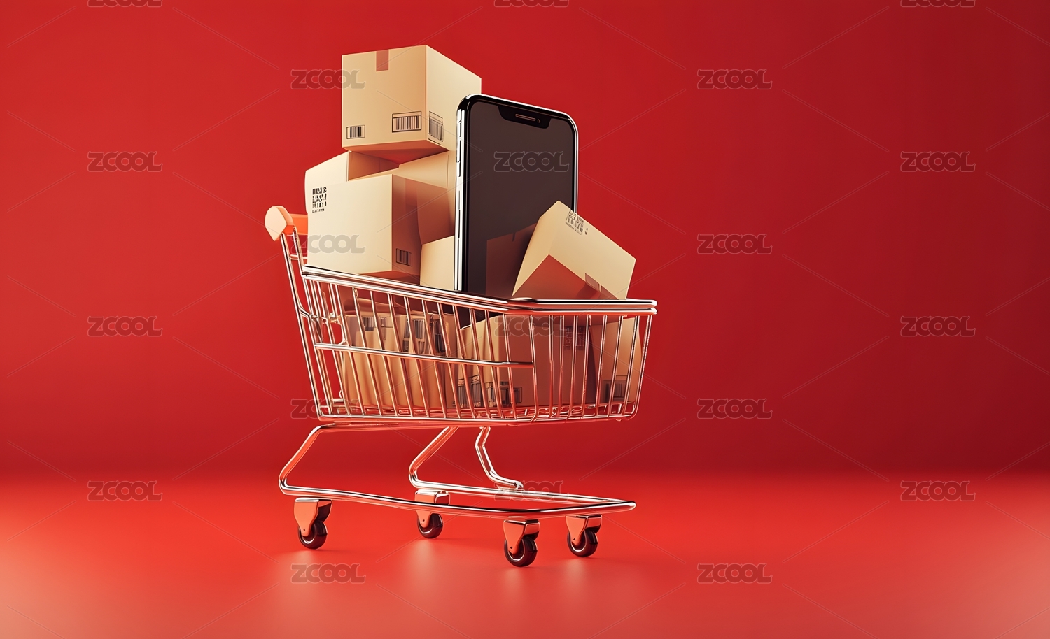 礼物促销题材的超市购物车和堆放的礼品盒