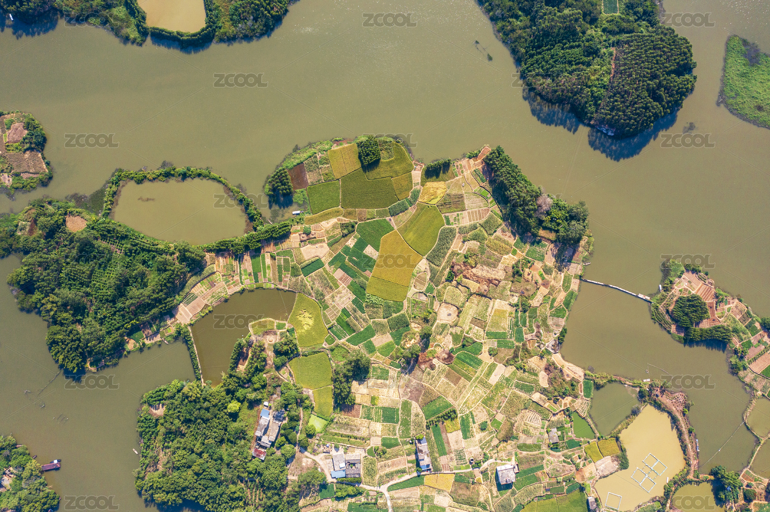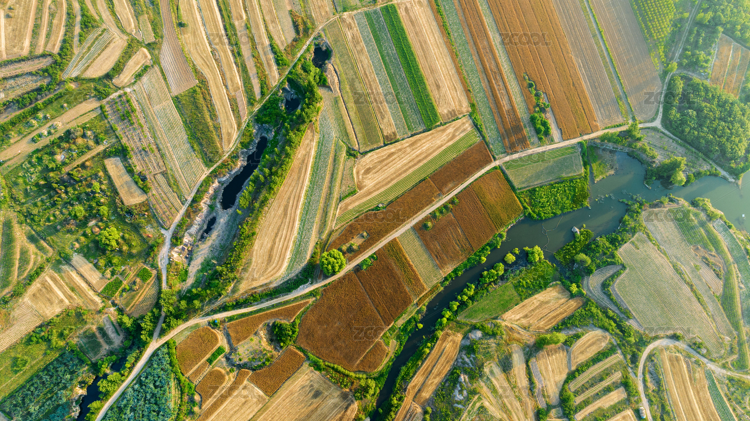 航拍初夏时节蜿蜒小河及绿色田园风光