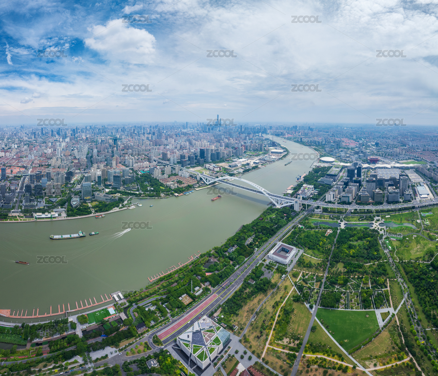 远眺上海黄浦江卢浦大桥陆家嘴三件套