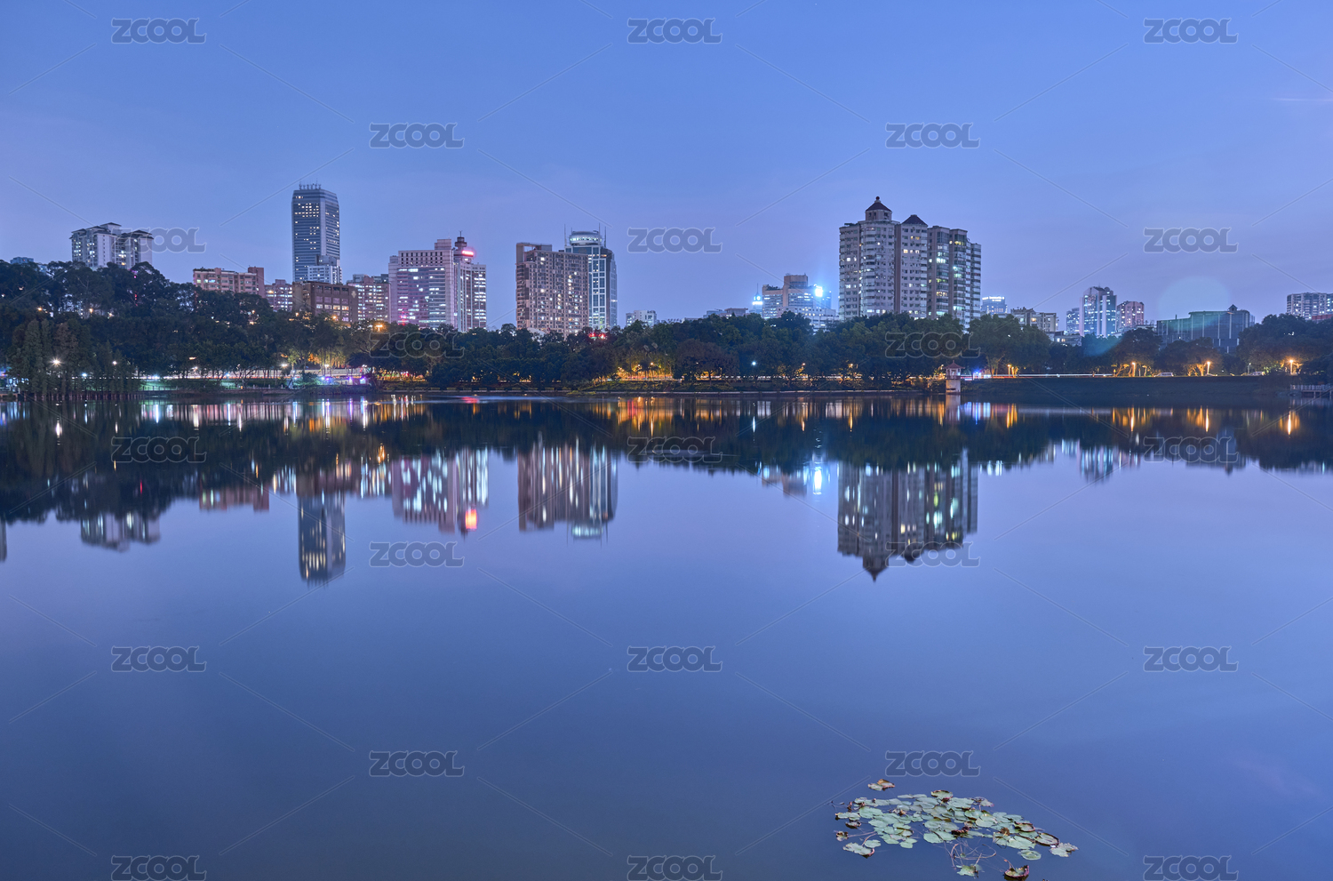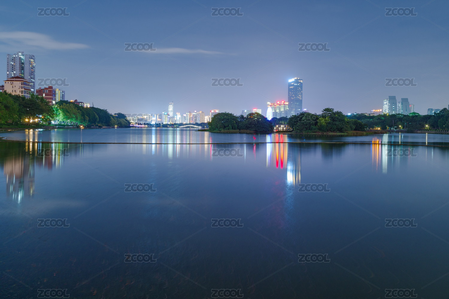南宁南湖公园夜景灯光与城市摩天大楼建筑